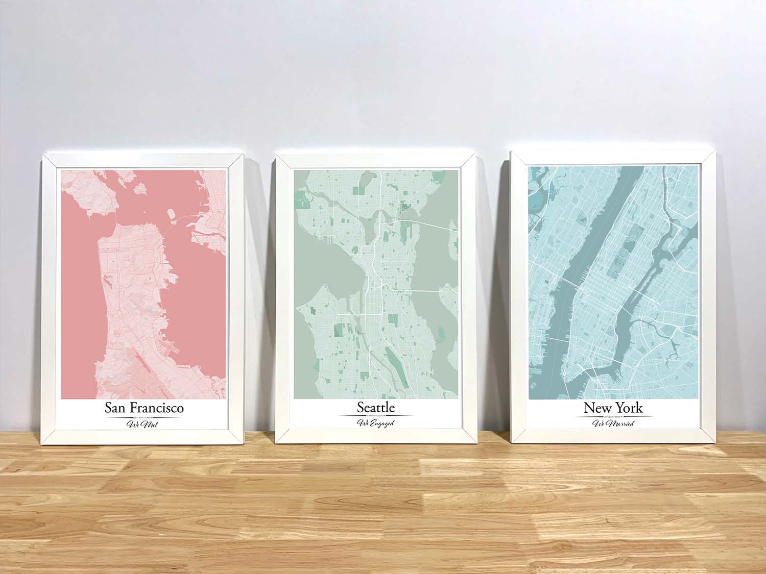 Our New City Maps come in 3 styles: Earth Tones, Pastels and Black and White.