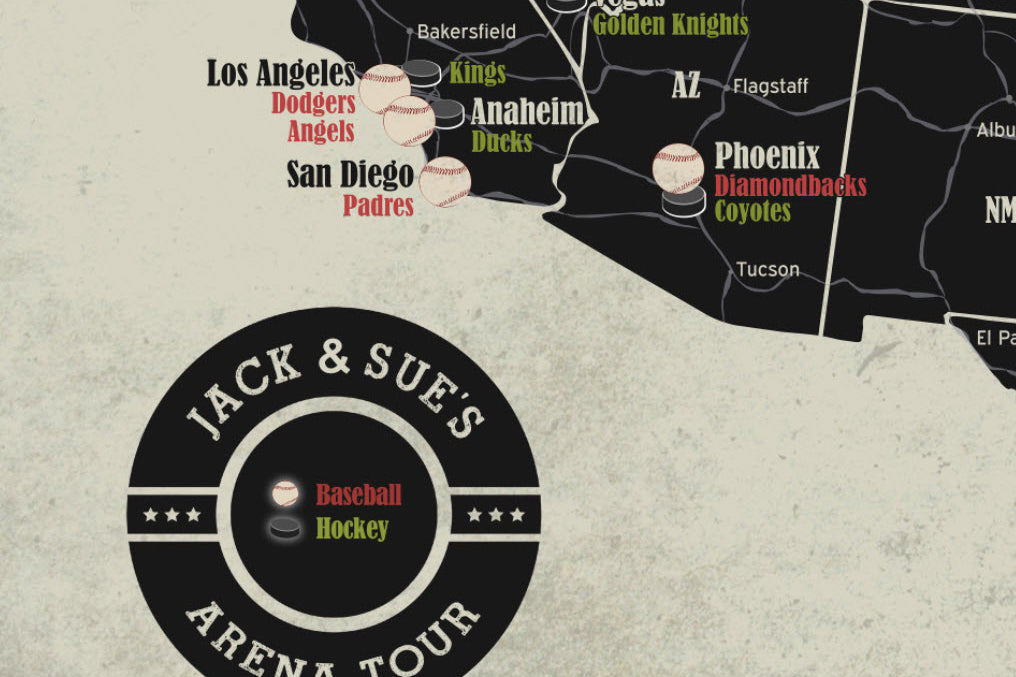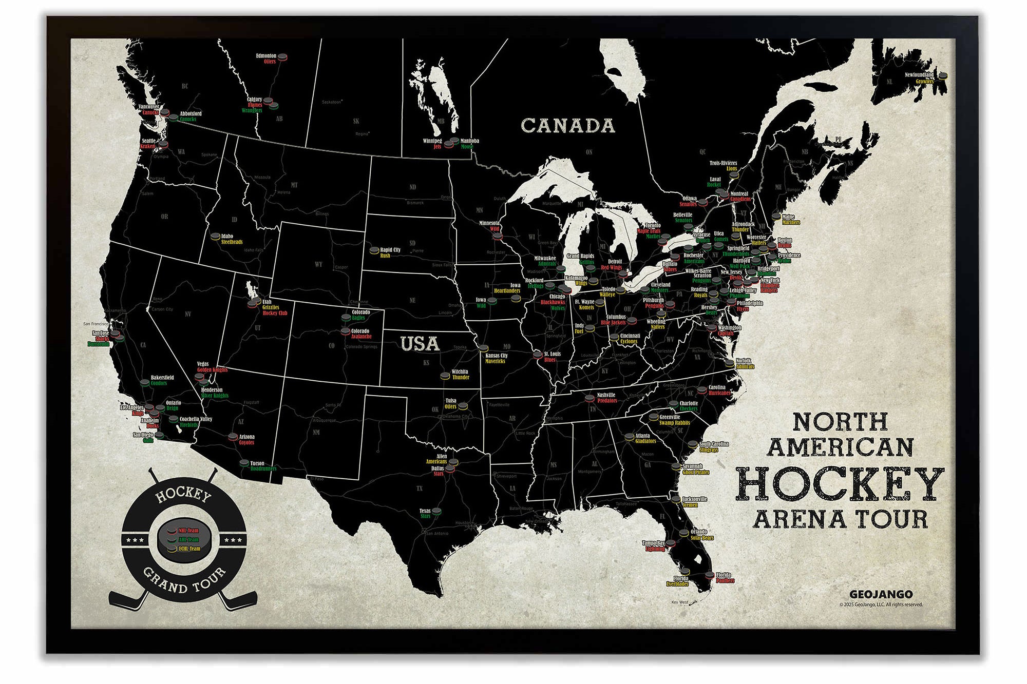 Our NHL Teams Map is the perfect gift for Hockey fans! This stunning sports map documents all of the Hockey Arenas in the USA and Canada and labels each location by team name. You can use the map to keep track of which NHL Arenas you've been to or which ones are still on your bucket list.