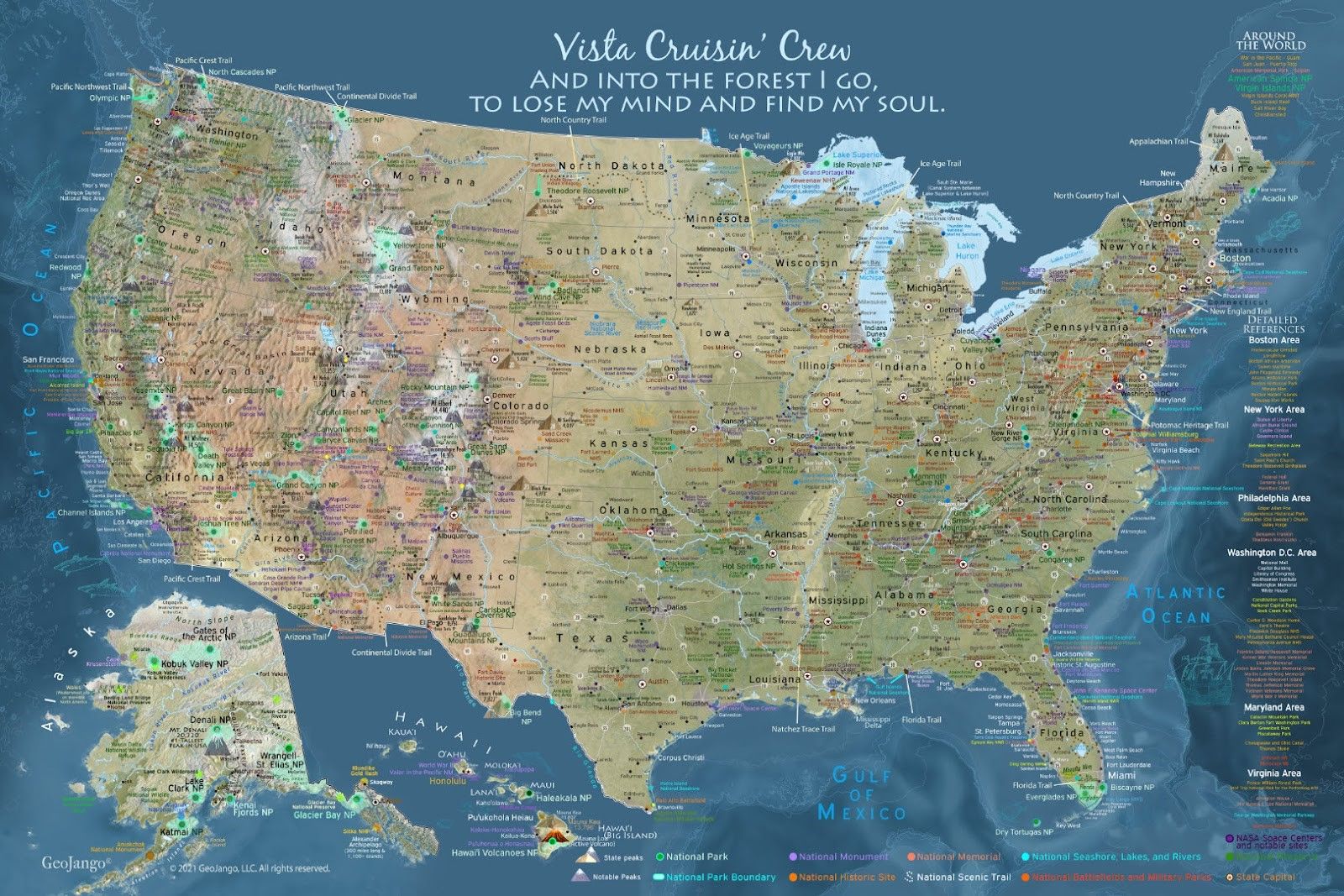 The map is a beautiful work of cartography. It balances science, geography, and traditional labeling practices together in a single piece. The map is a valuable tool for learning more about our vast country. Trace your path along the U.S. interstates to plan your road trips and visit the thousands of sites in your adventures. Maps are perfect for storytelling!