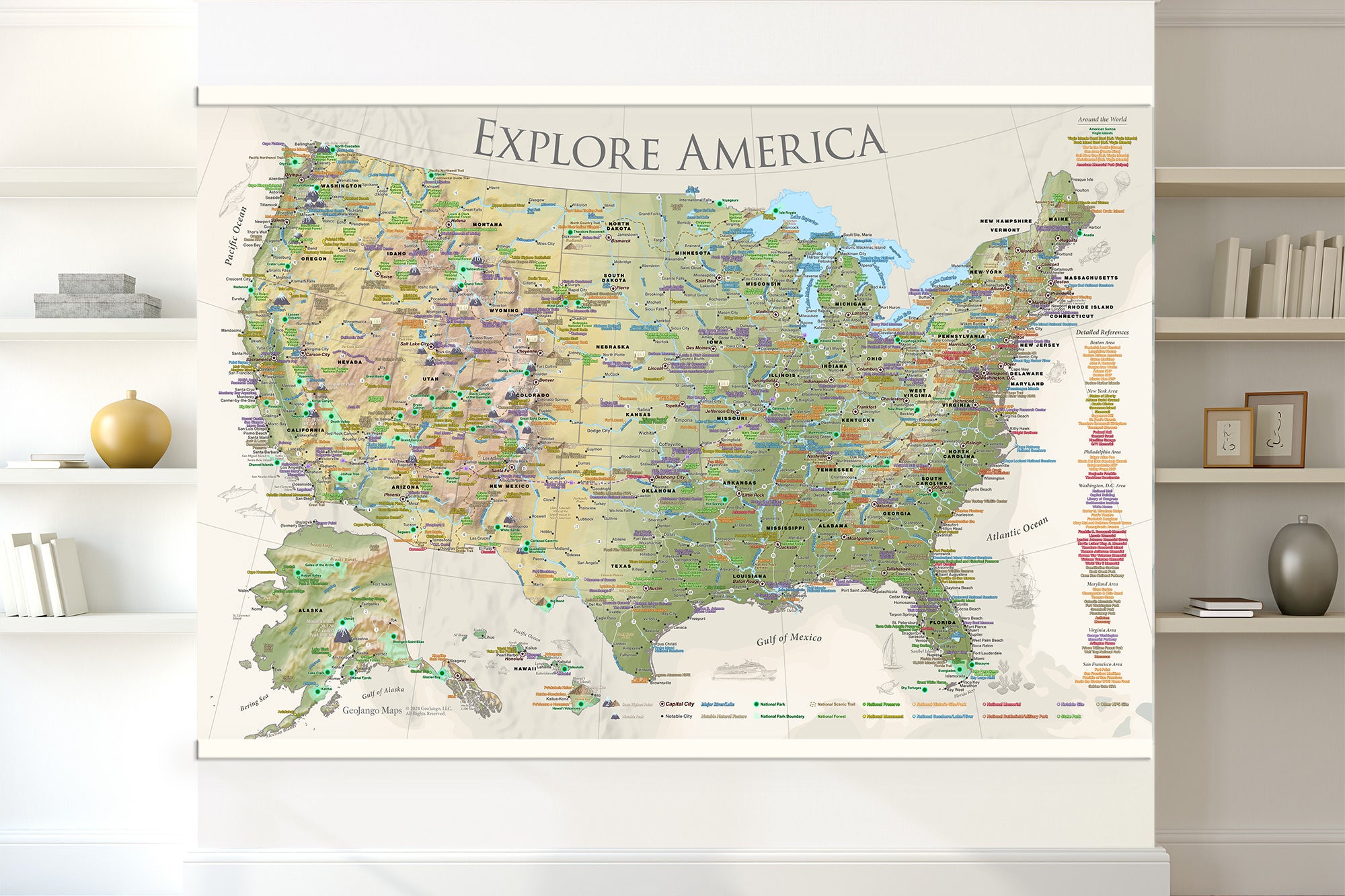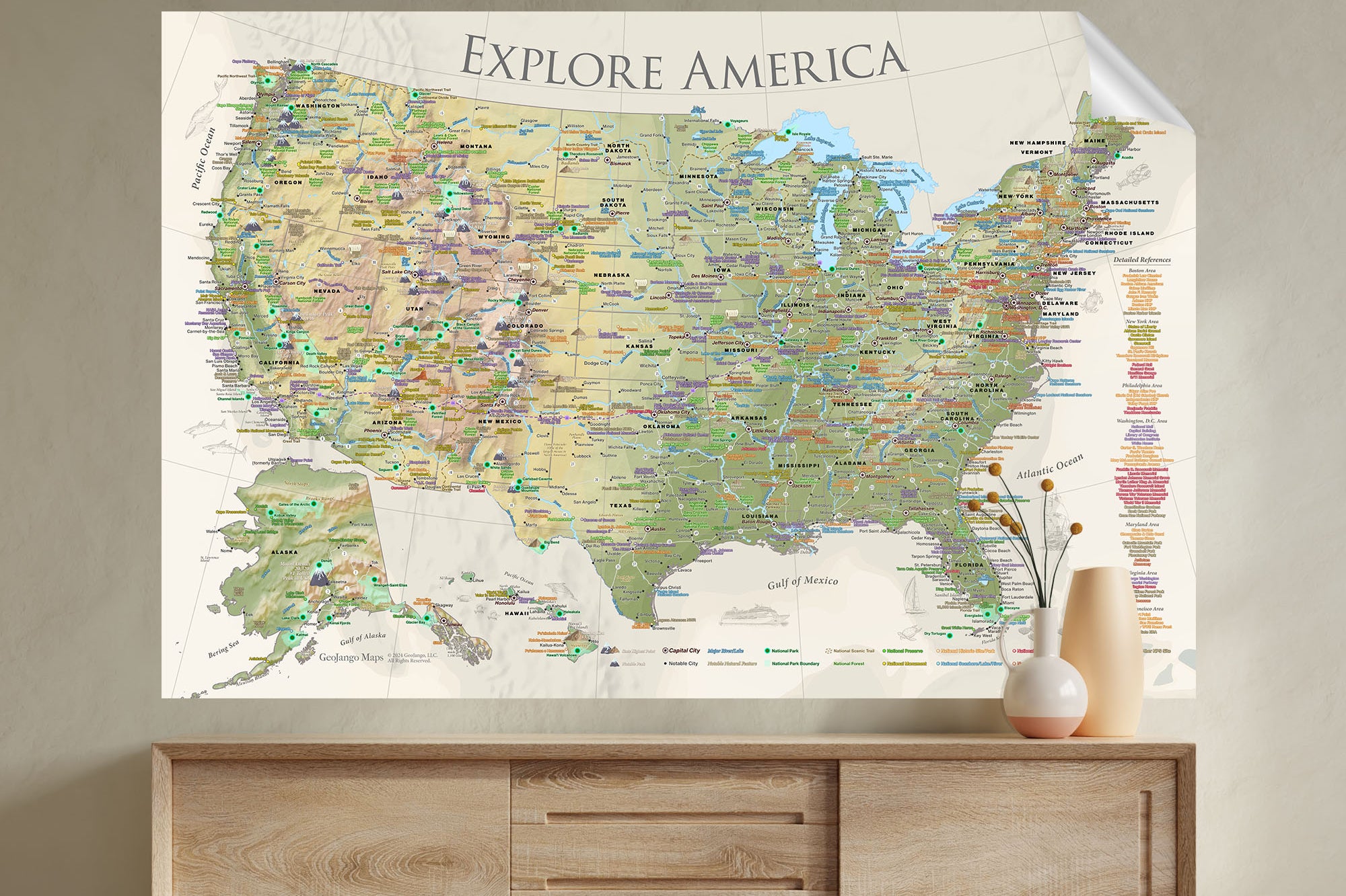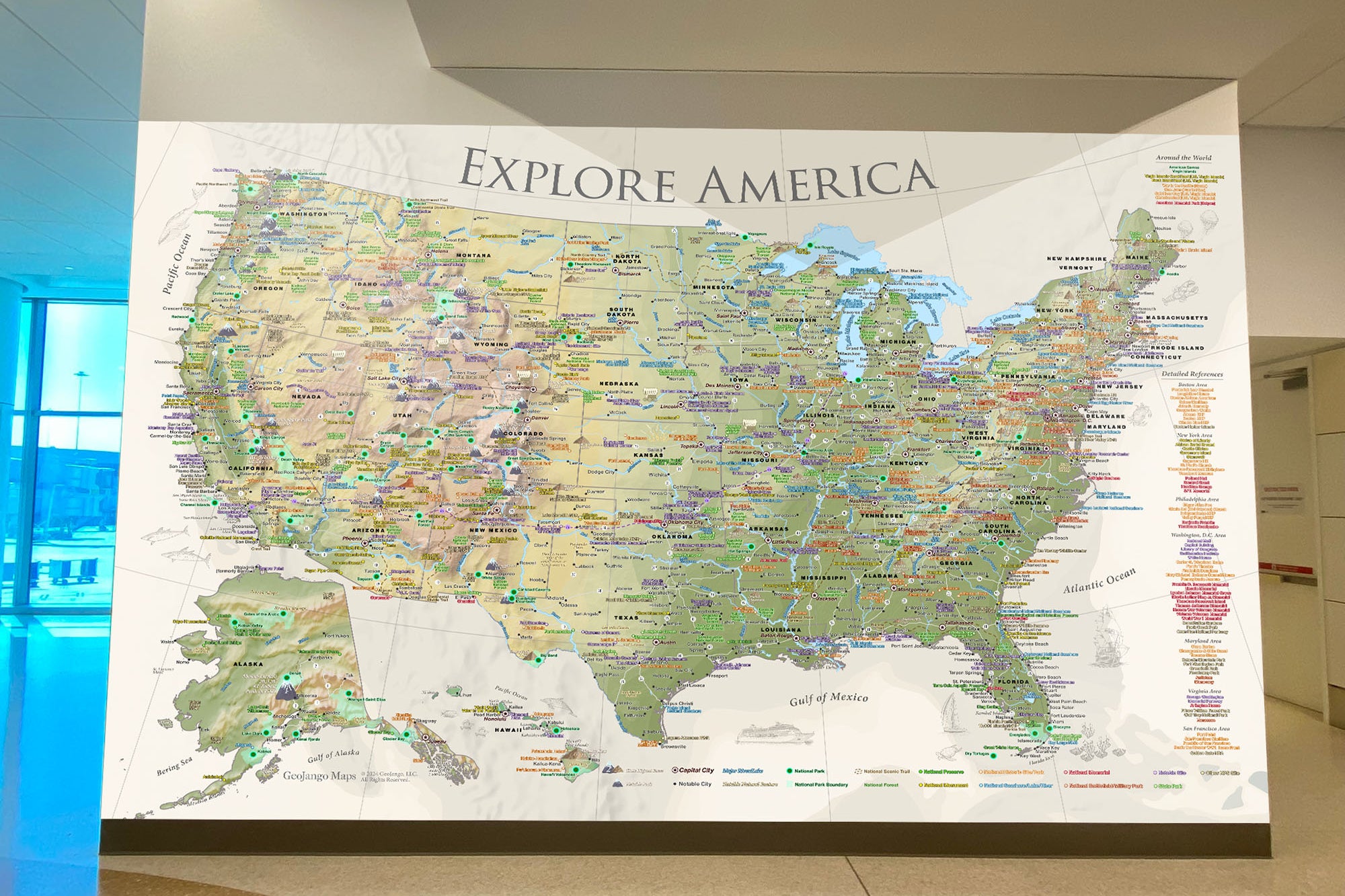 The World Map Wall Decals include ancient civilizations, famous voyages, oceanic terrain, UNESCO World Heritage Sites, and much more. The USA Map Wall Decals include National Parks, National Monuments, historic cities, major highways, and other fascinating sites within the United States. All of our Removable Wall Decals are made in the USA with the highest quality materials. The Sports Wall Decals include the stadium locations of all major league teams within each sports category.