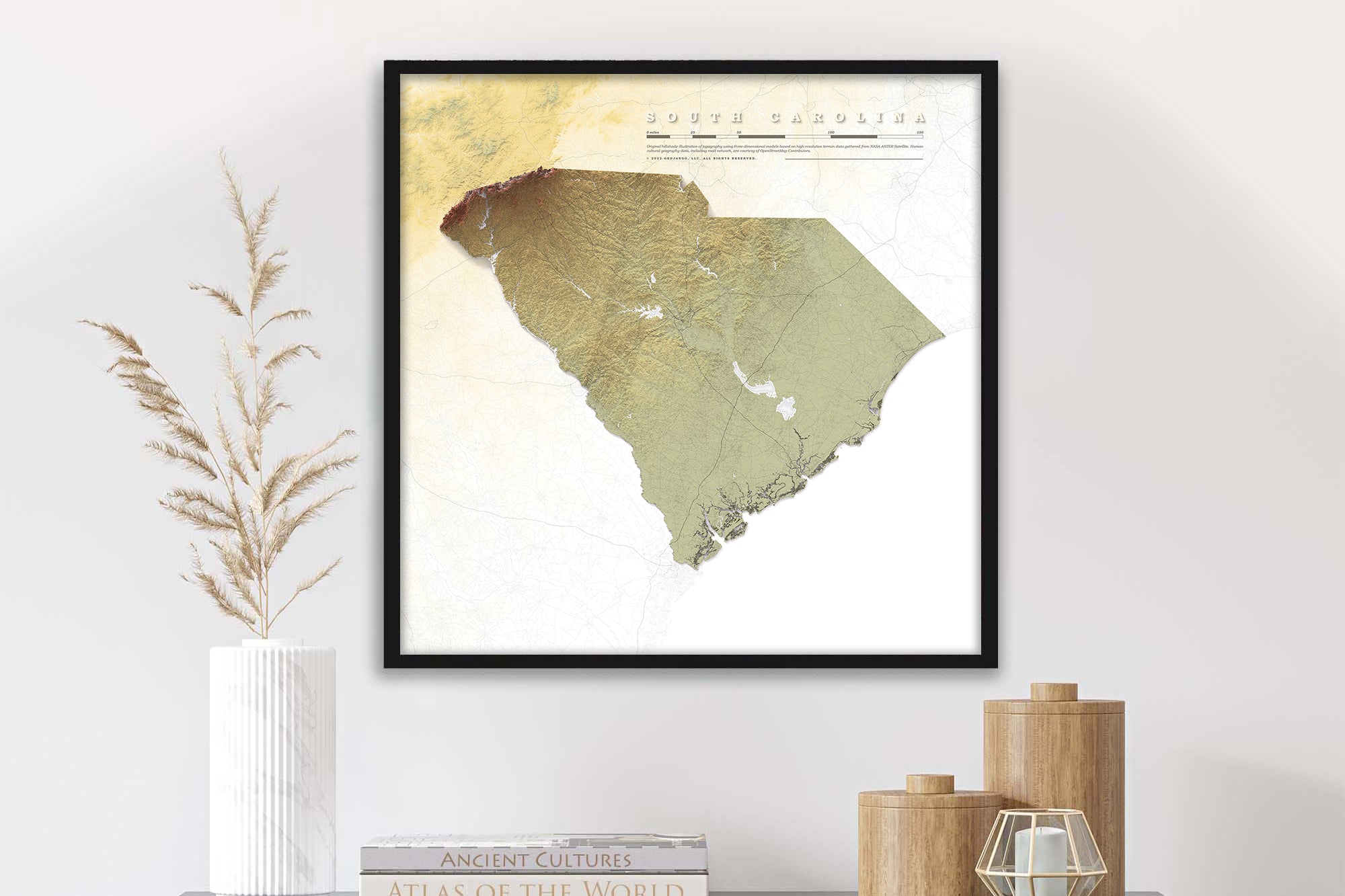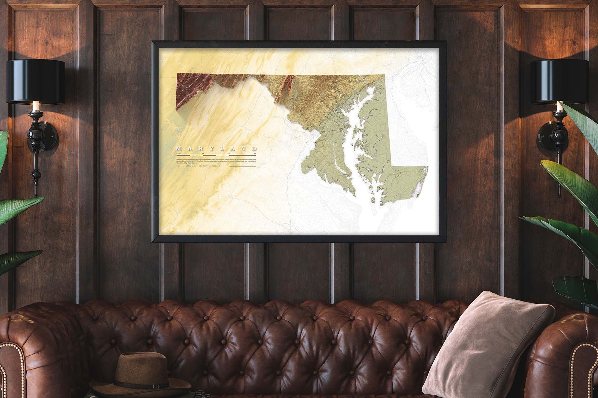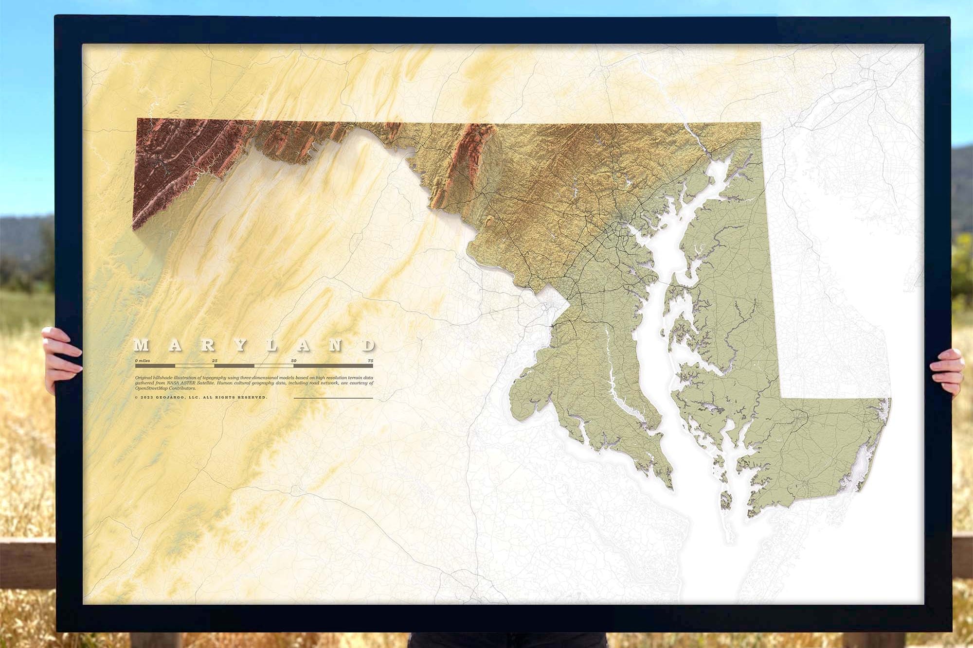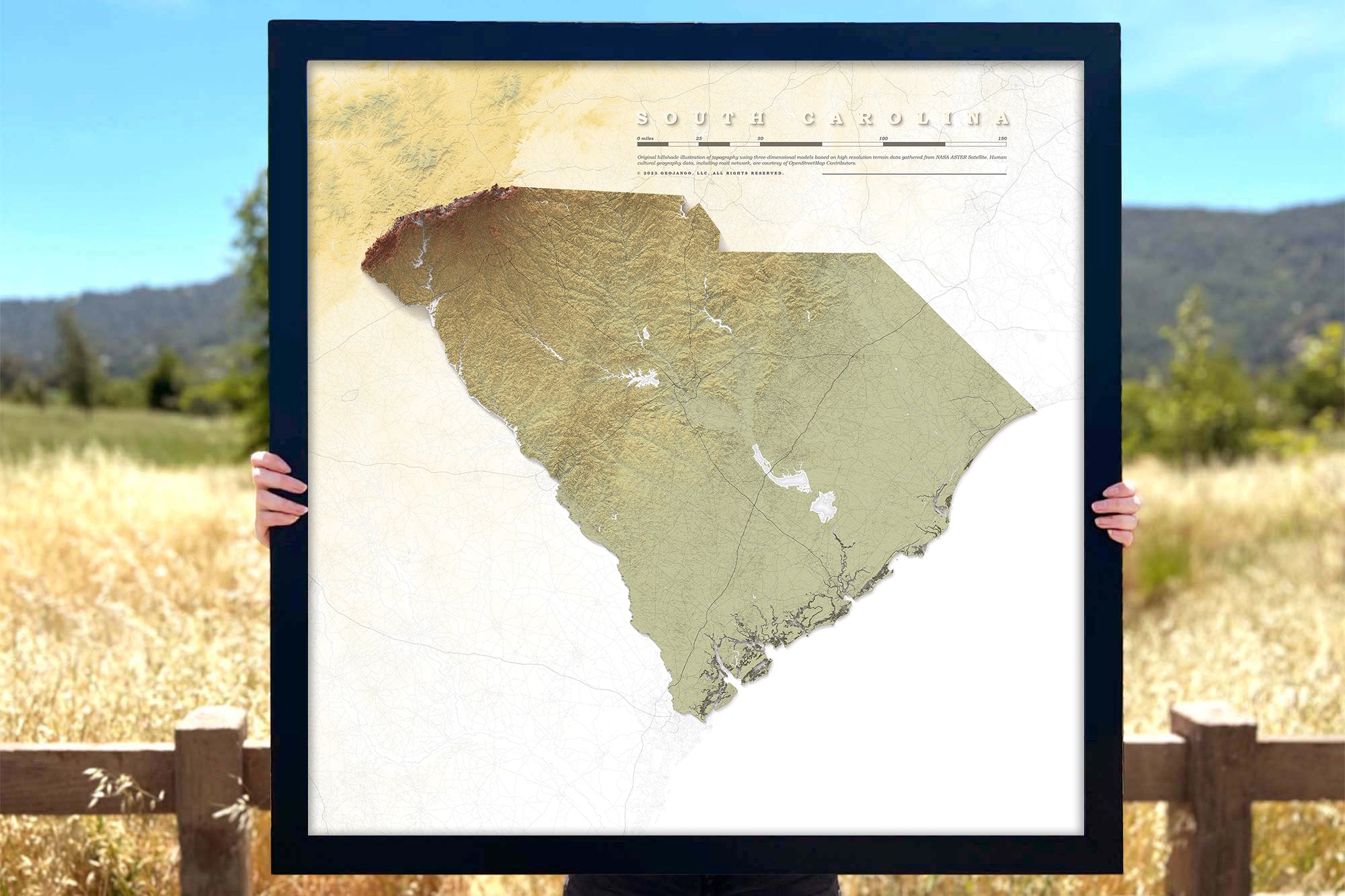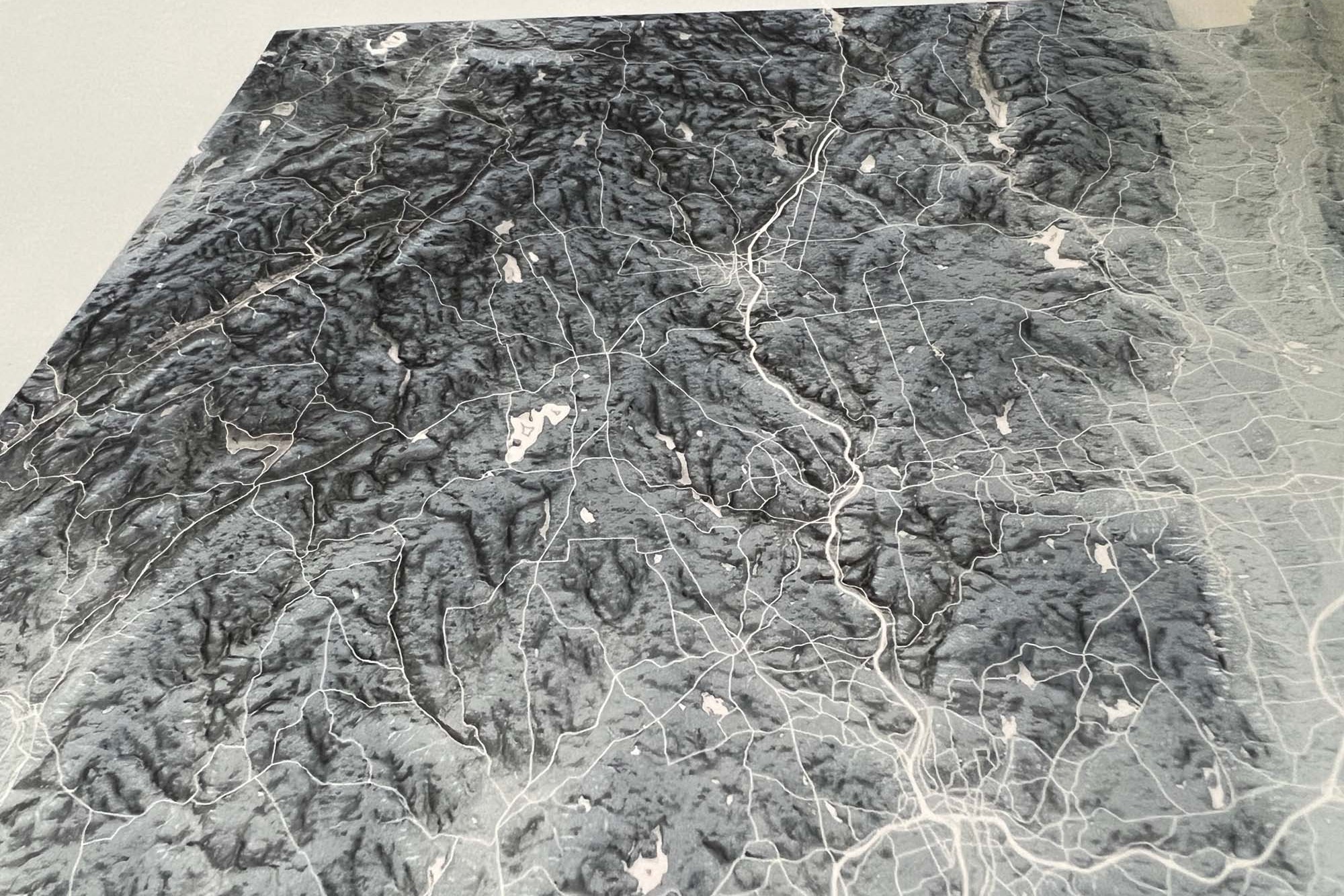 Map art featuring shaded relief and elevation, detailing the intricate features of the land as only a local could enjoy them. Every peak, valley, and hill casting beautiful shadows, with roads seen winding through mountain ranges.