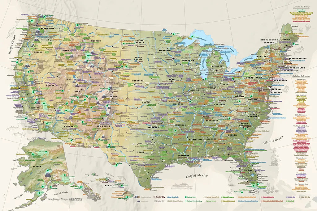 Cartographic Details: Crafted with precision using advanced GIS technology, our map combines authoritative data from sources like the National Parks Service and USGS, presented through stunning cartographic designs. The result is a visually striking and accurate portrayal of the U.S. landscape.