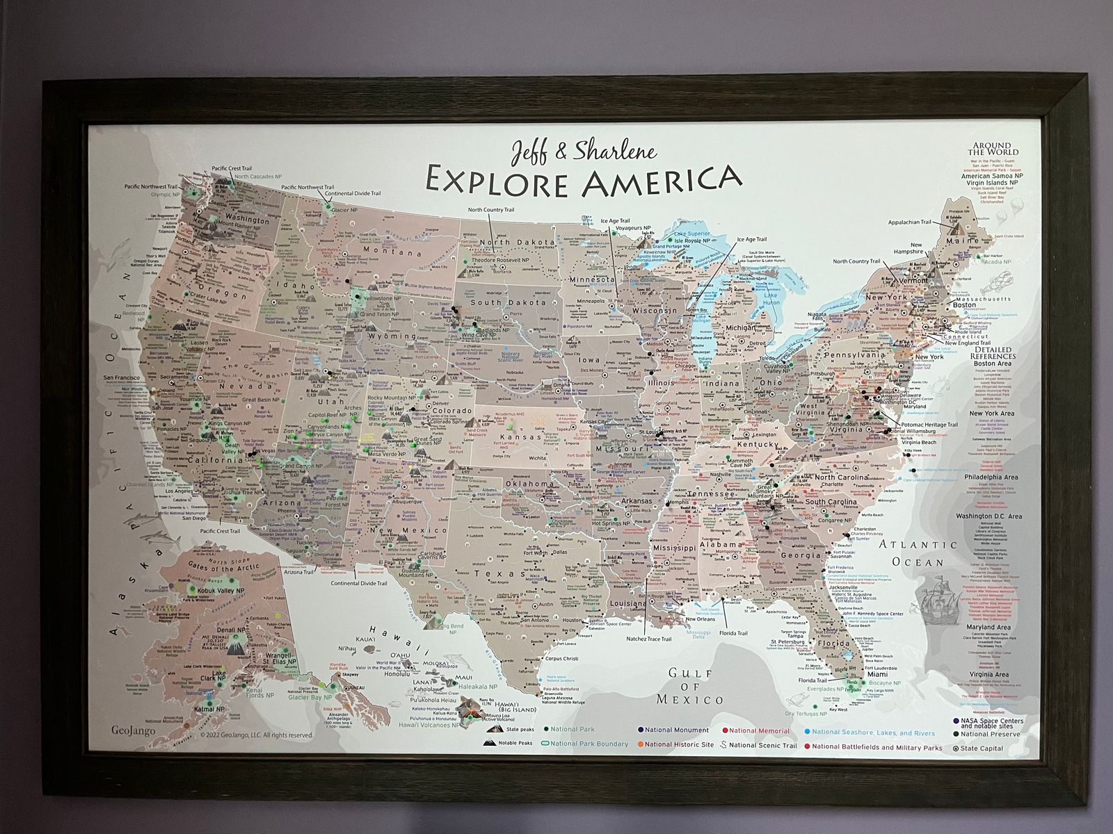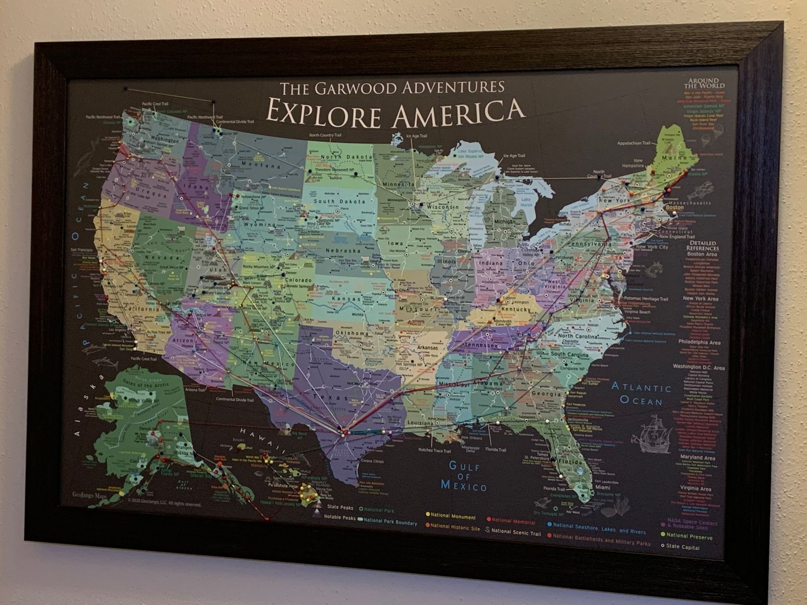 What's Included with a Canvas Wrap or Framed Map: 500 Map pins and pin case. Each push pin map is individually made to order with archival quality materials. The print is mounted to gatorfoam pinboard, which will not warp, bend, or crush like cork or foamcore. We prepare the map with premium hanging hardware so you can start pinning your adventures immediately. This exclusive hanging solution keeps the map stable on your wall, even while pinning where you've been. The map is nicely packaged and shipped in a large box, ready to give as a gift.