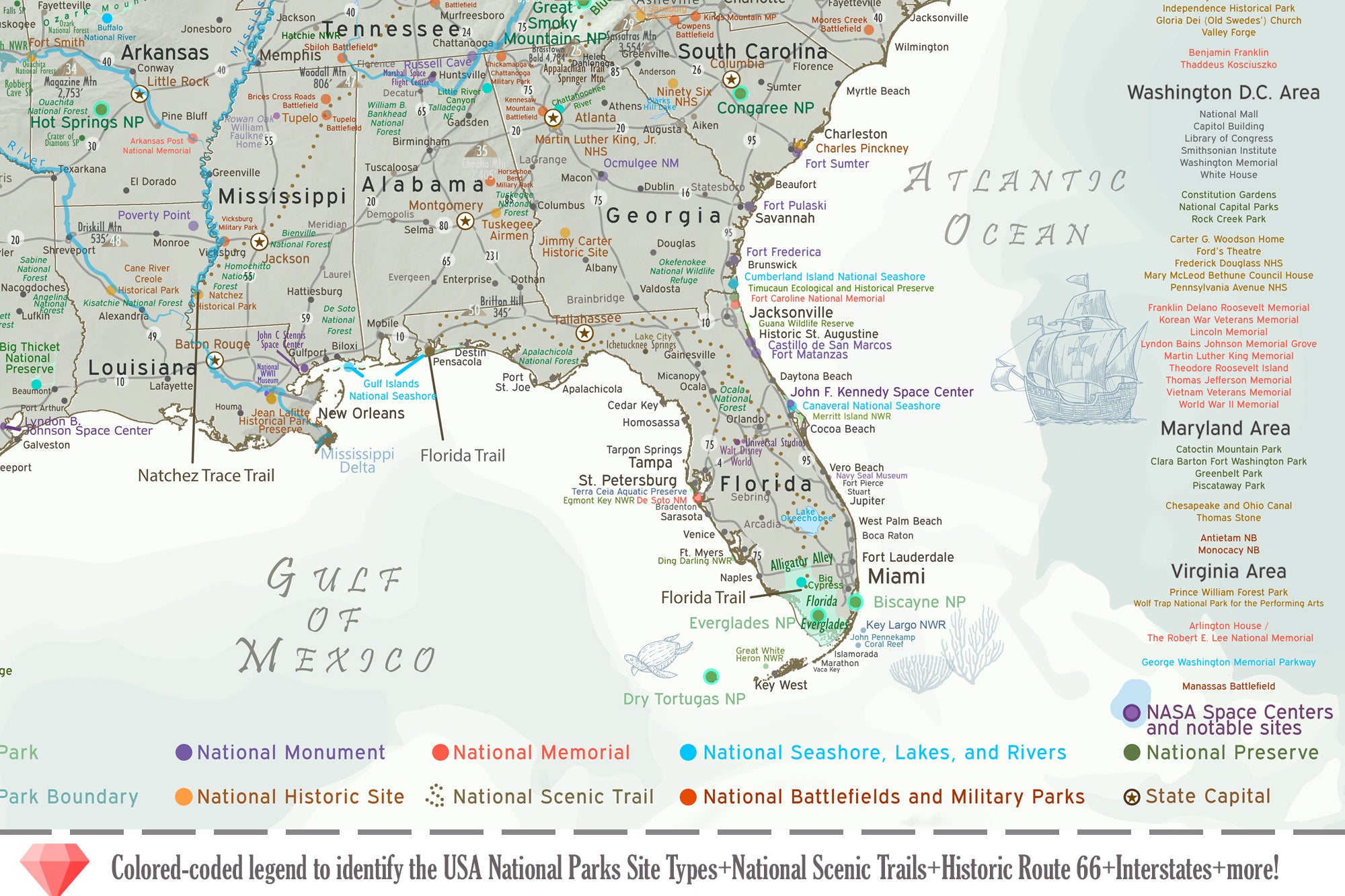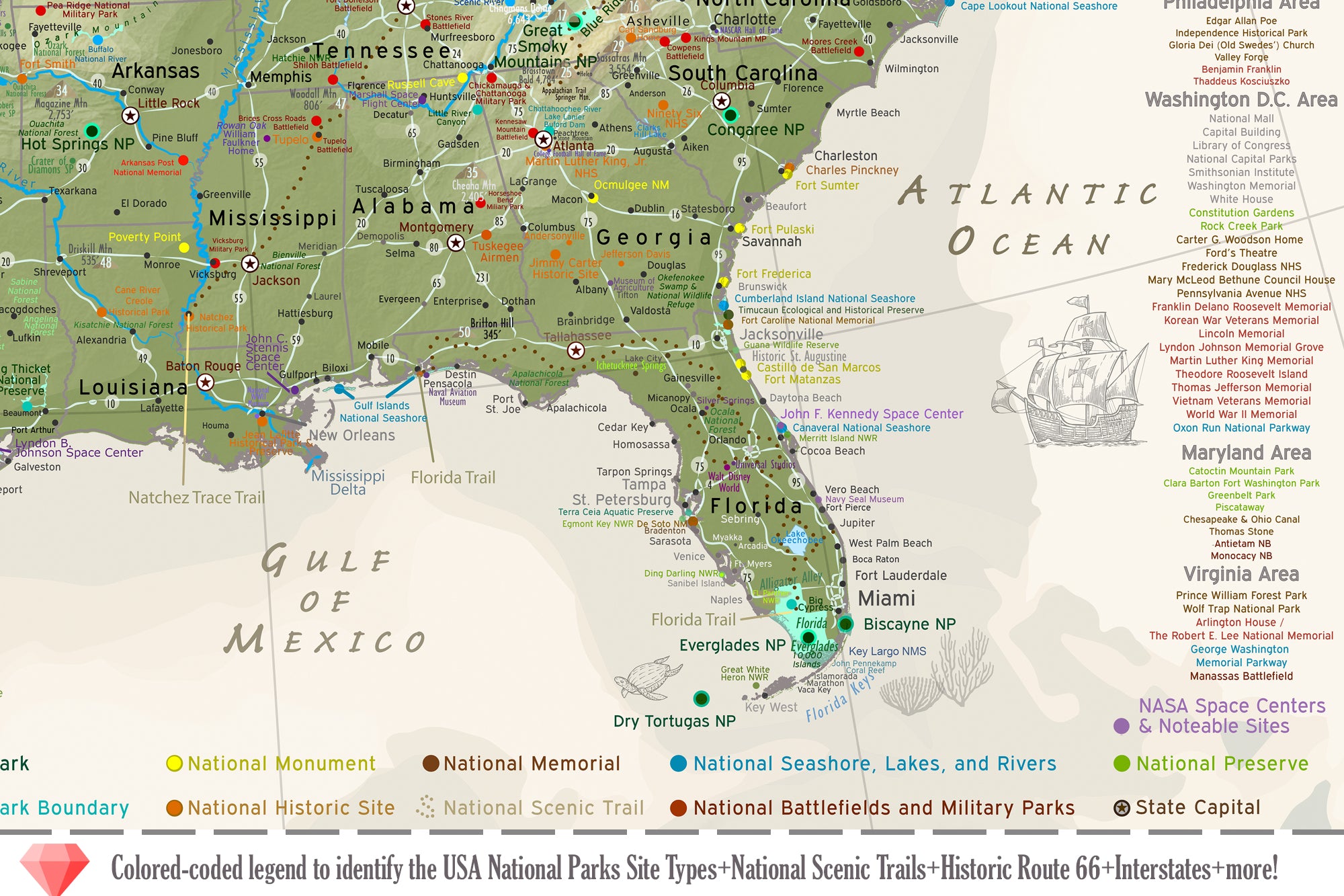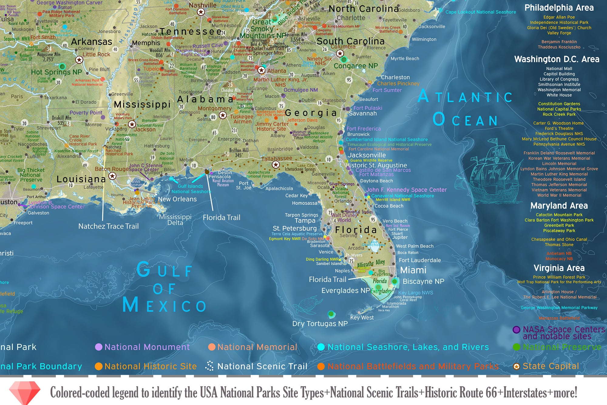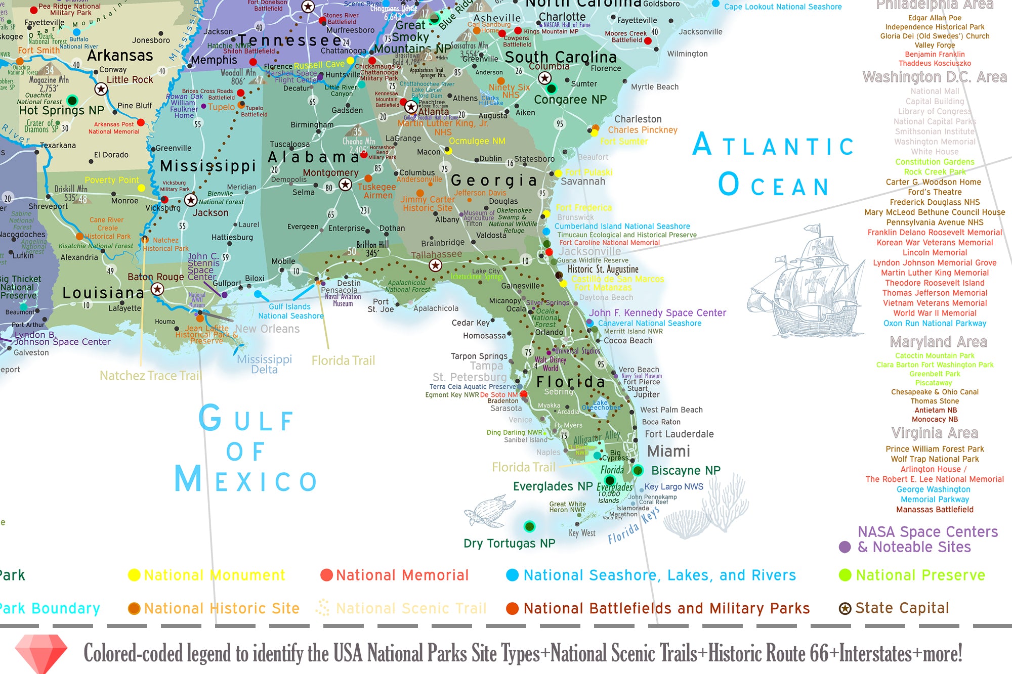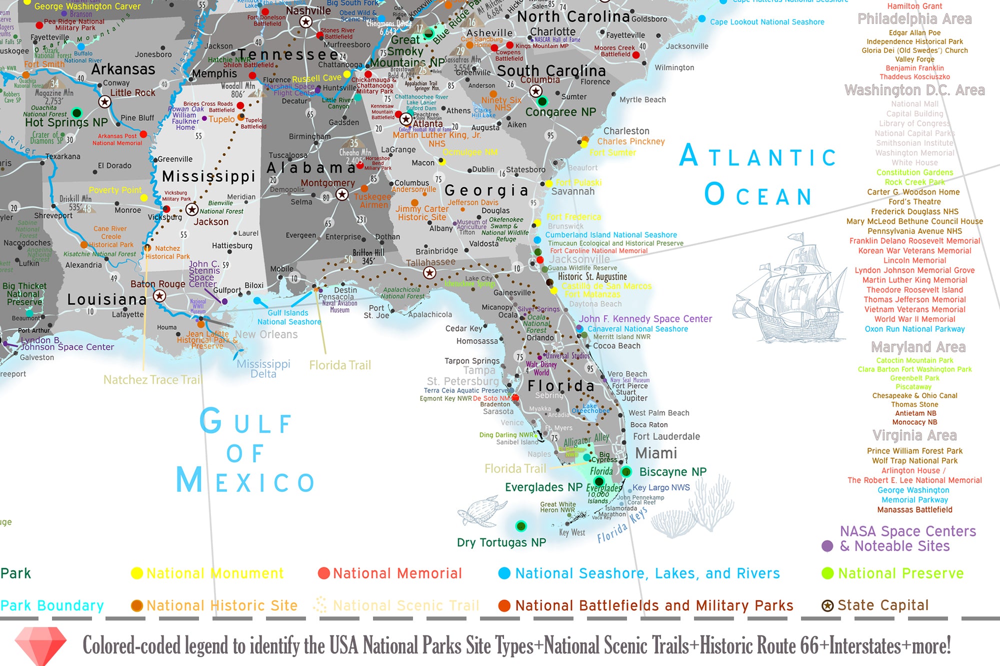 - Our USA maps include more than the 63 National Parks! The map features over 600 NPS Historical Sites, National Monuments, NPS Wildlife Preserves, Historical Battlefields, and you can trace the path of the National Scenic Trails such as the Appalachian Trail and more!