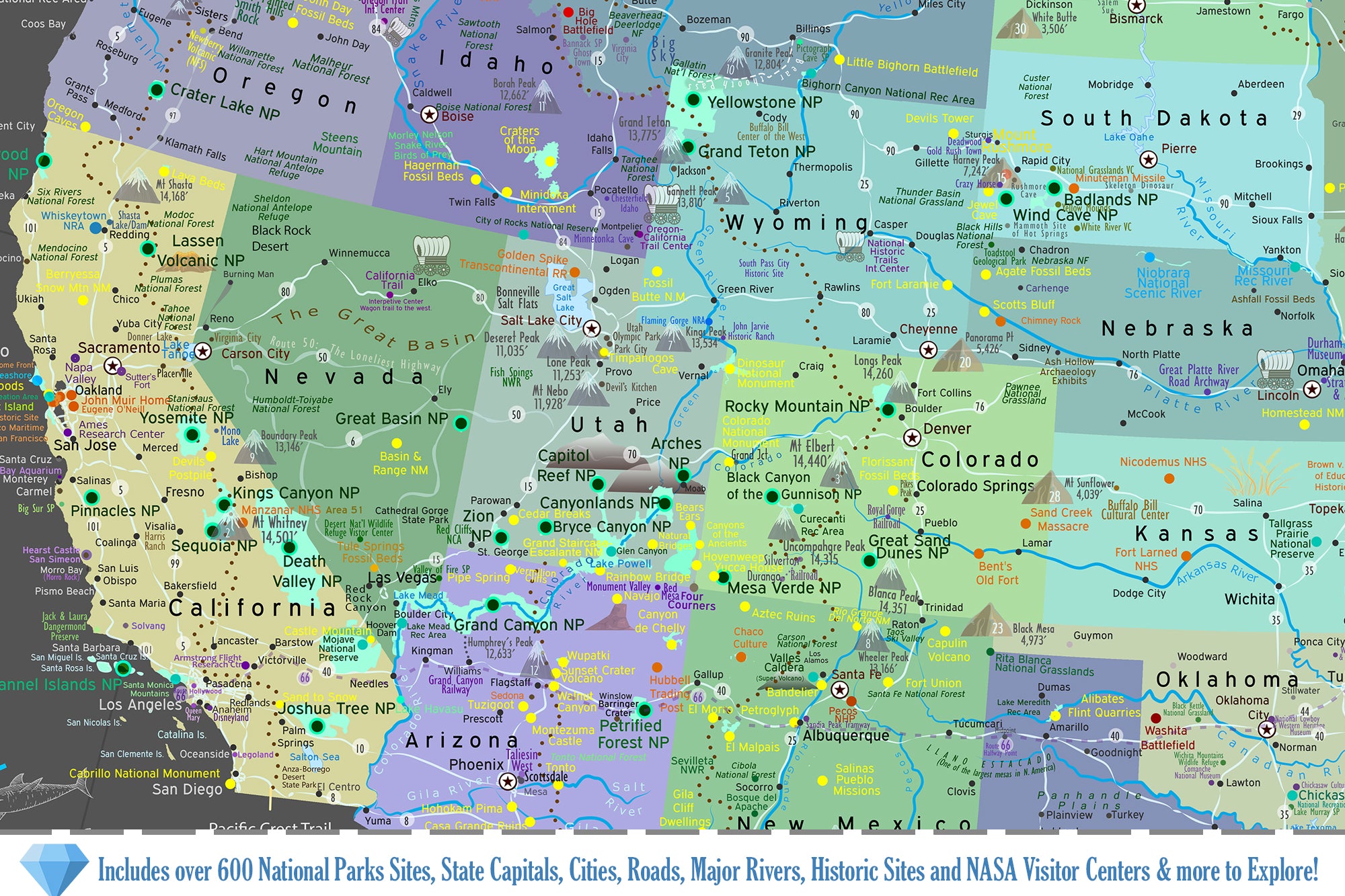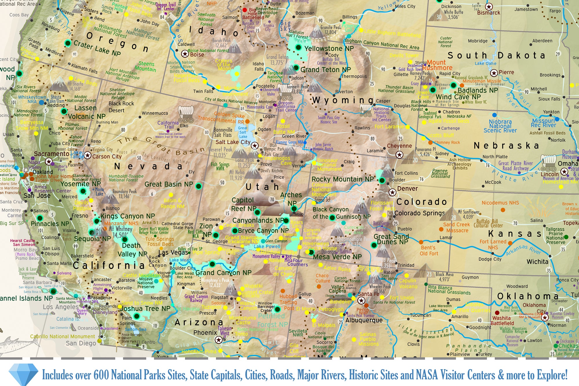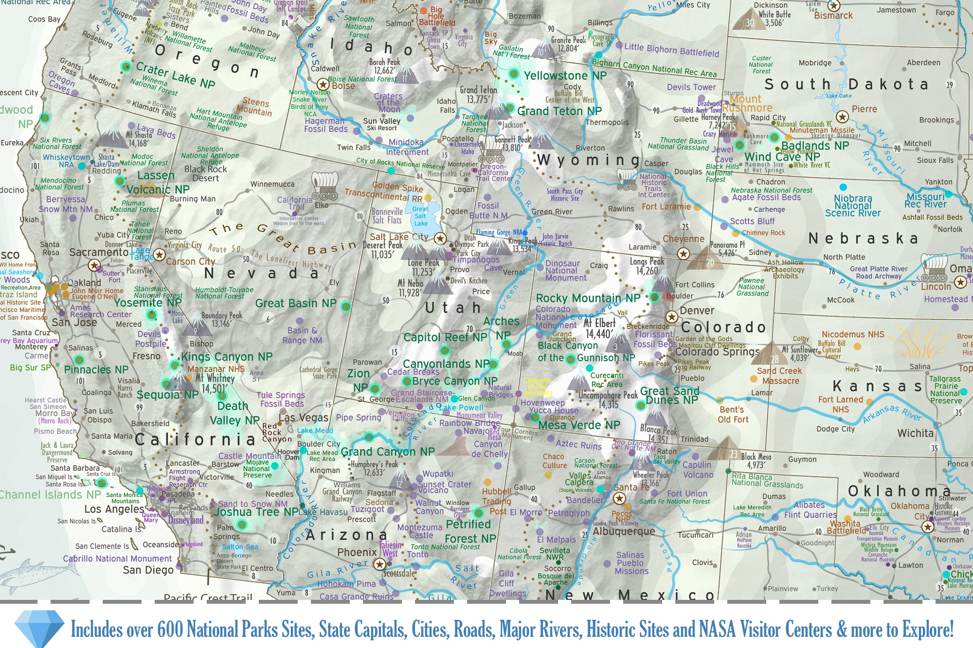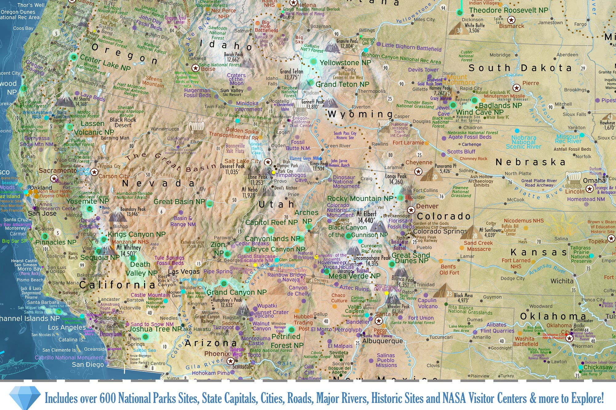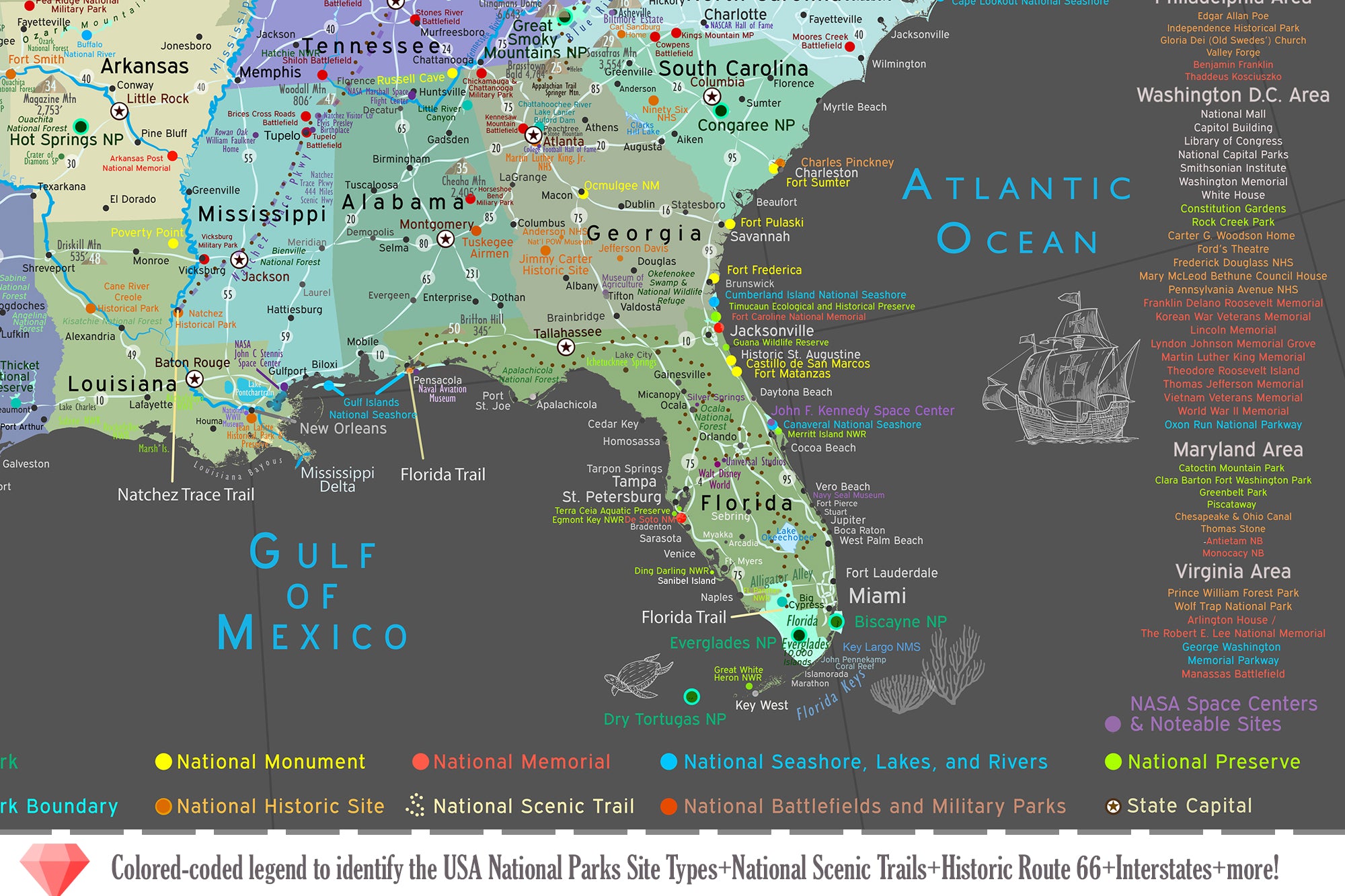 - Our USA maps include more than the 63 National Parks! The map features over 600 NPS Historical Sites, National Monuments, NPS Wildlife Preserves, Historical Battlefields, and you can trace the path of the National Scenic Trails such as the Appalachian Trail and more!