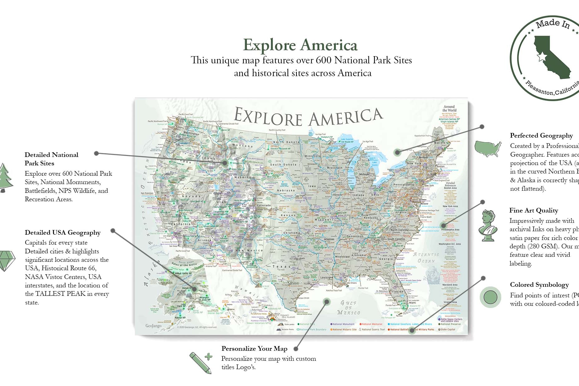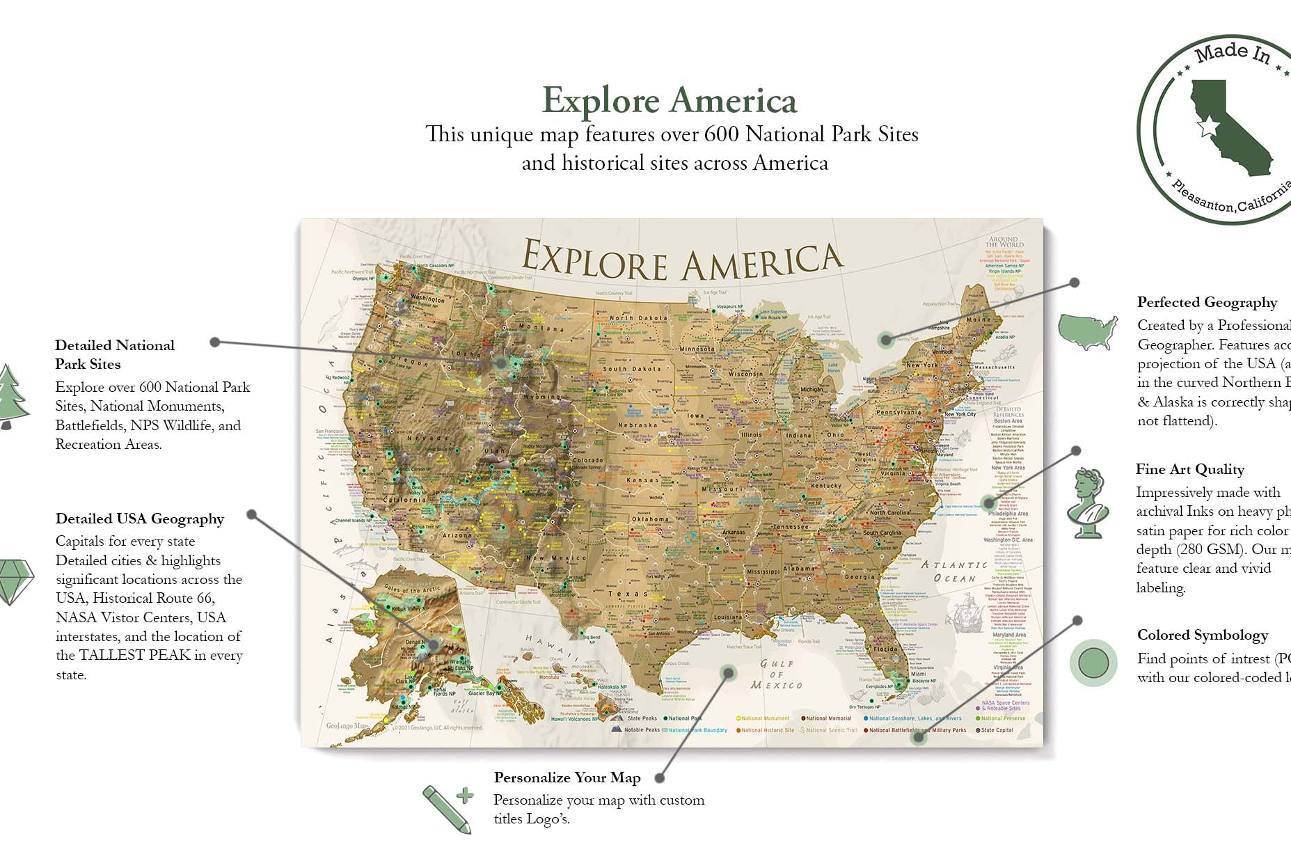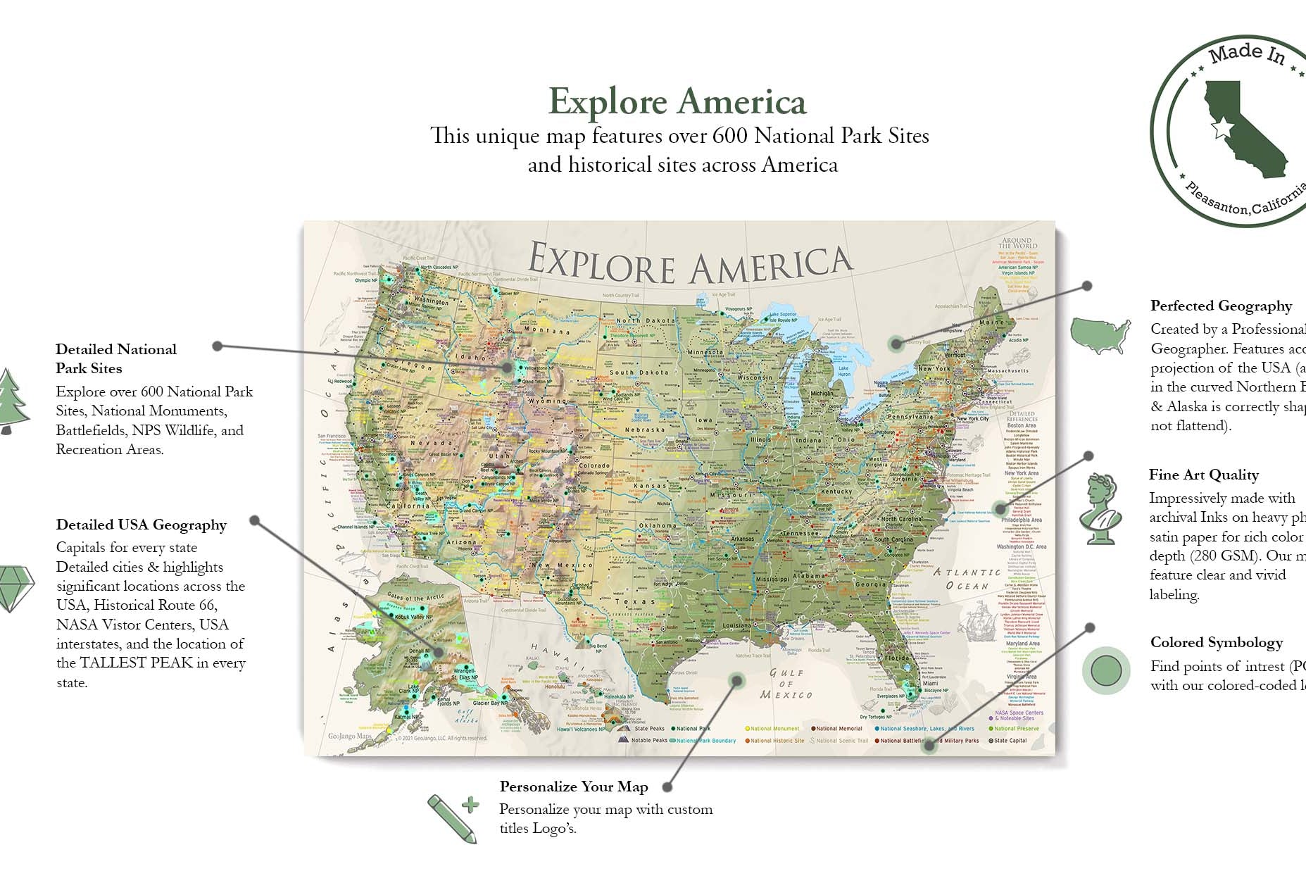 - The Explore America USA Map is THE most detailed USA National Parks List Map available anywhere! This unique map features all of the National Park Service (NPS) Parks, Historical Parks, National Monuments, Battlefields, Lakeshores, Preserves, and other fascinating destination spots preserved for our nation.