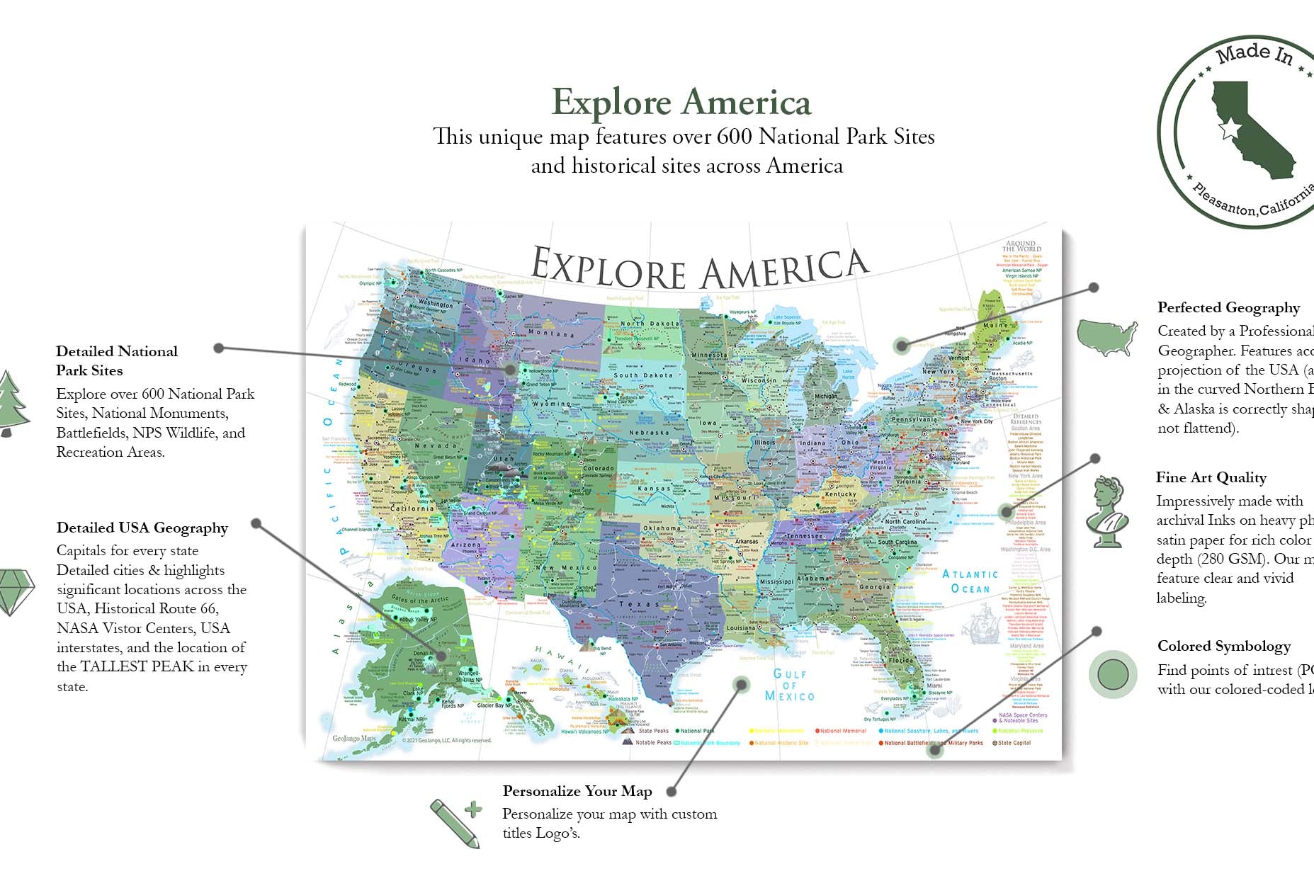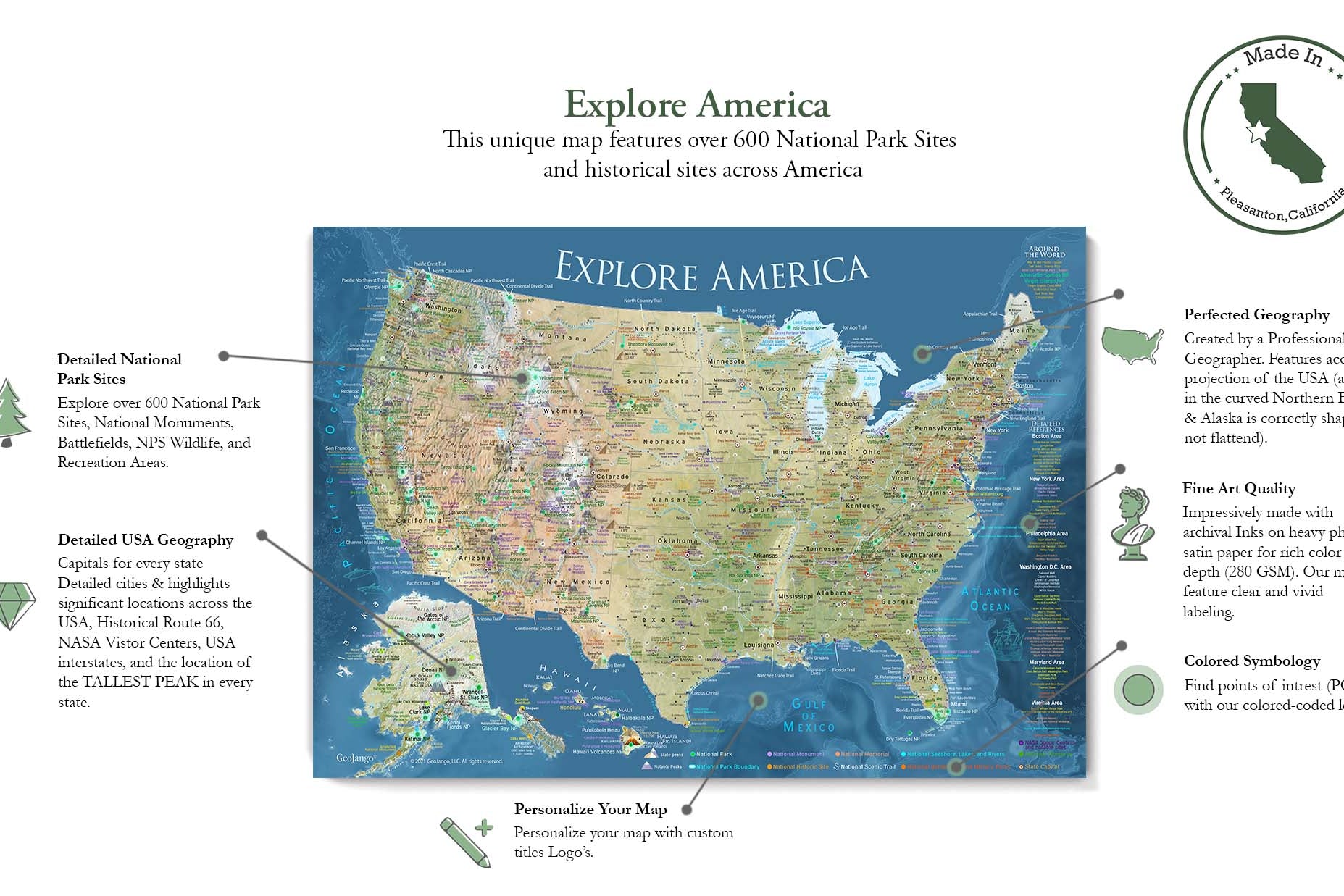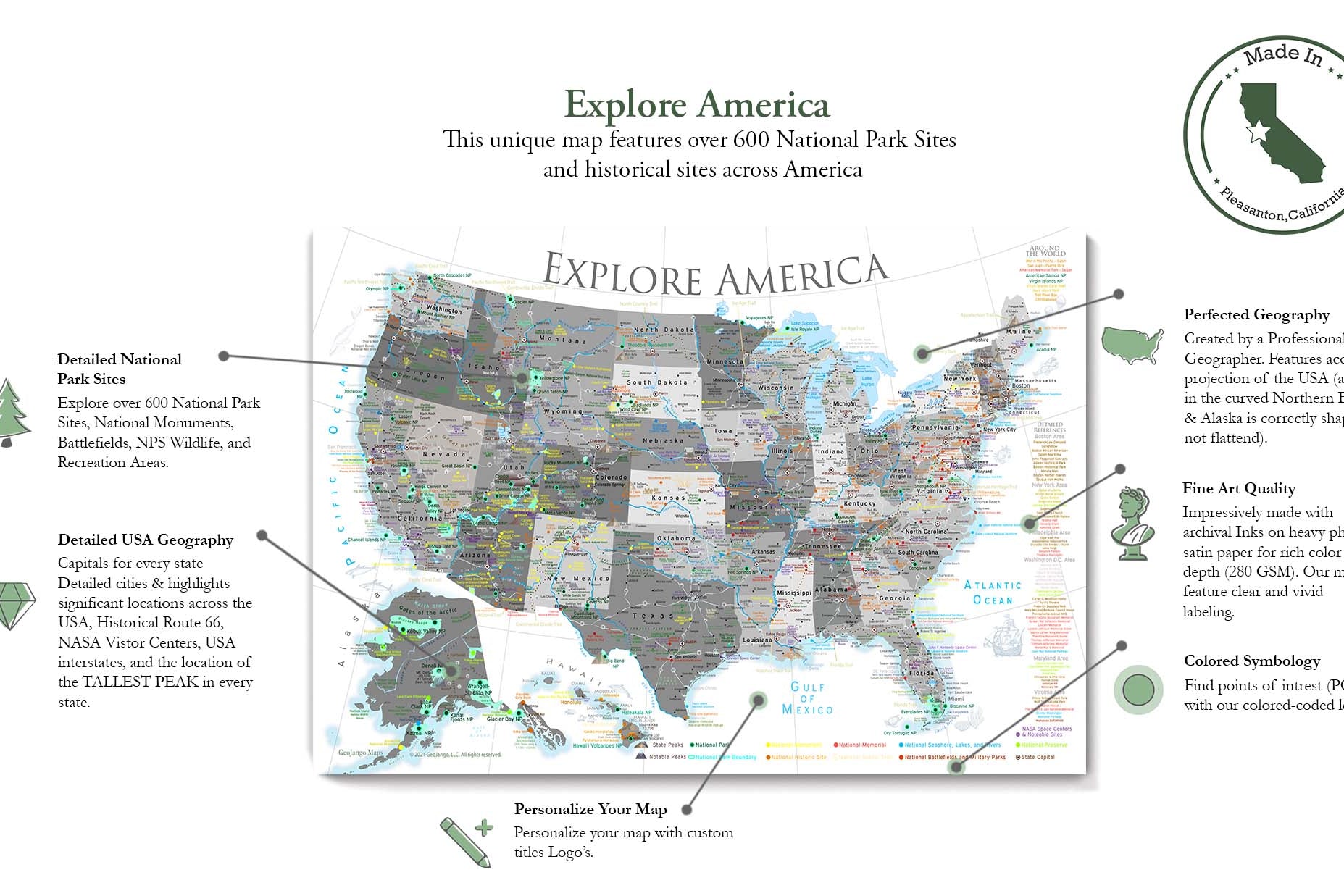 - The Explore America USA Map is THE most detailed USA National Parks List Map available anywhere! This unique map features all of the National Park Service (NPS) Parks, Historical Parks, National Monuments, Battlefields, Lakeshores, Preserves, and other fascinating destination spots preserved for our nation.