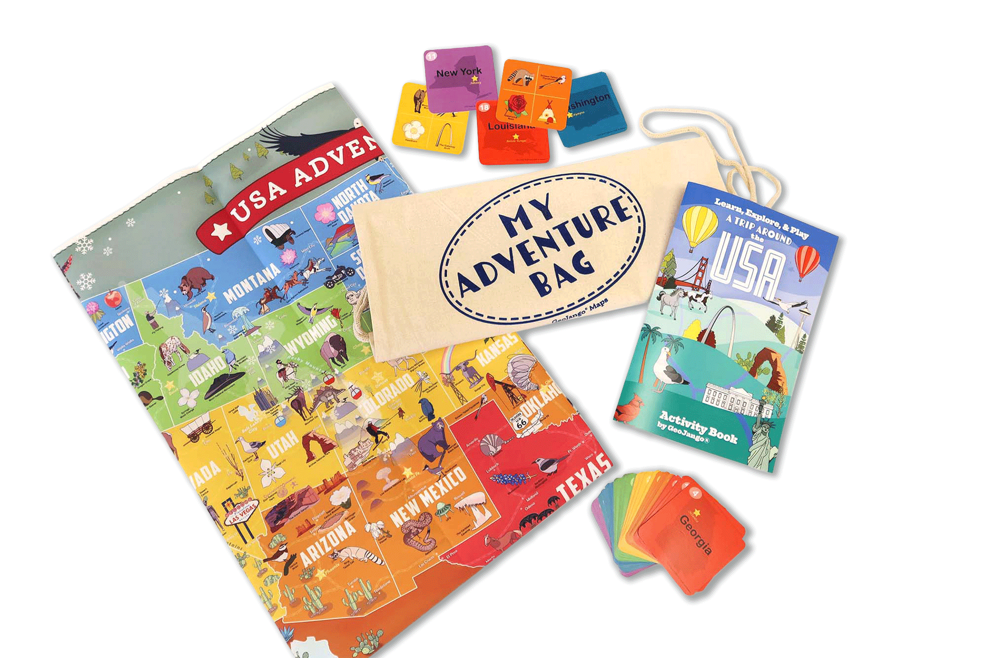This fun and educational geography bundle includes a HUGE USA ILLUSTRATED MAP, a card deck for GAME PLAY, and a learning ACTIVITY BOOK to keep the whole family excited, engaged and learning!