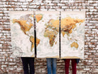 Our Magellan World Map 3 Panel Map is an impressive old-world map style. The 3 panel map is created by expert Geographers, produced as fine artwork and hand-crafted by a professional craftsman. The material includes 3 solid wood interior framed for stretching the premium canvas material. We use the highest quality 2" wood and a tight weaved canvas that is ideal to display the details in our maps. The maps can be touched and push pins can be placed on the map. The map is impressive and a statement piece. It can be used all wall art, reference material, and push pins can be used on the map. The pin holes would be too small to see if any were removed. The quality of the pin backing board is outstanding and built to last of decades. The structure is stronger than traditional foam core pin maps, we use the highest grade of materials for our cartographic work.