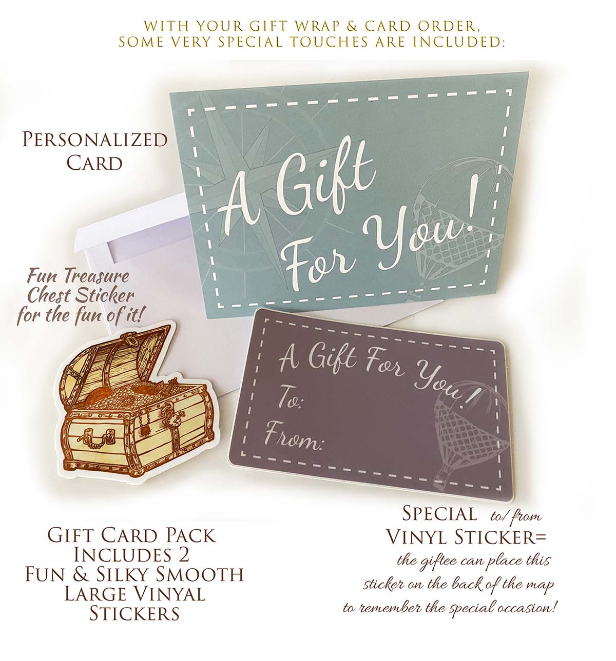 The map is nicely wrapped (heavy-weight/high quality wrap paper) and includes a beautifully designed Card with your message, plus a giant A Gift For You! sticker that can be placed on back of the map to remember the special occasion. Plus, one more surprise: a fun Treasure Chest Sticker!