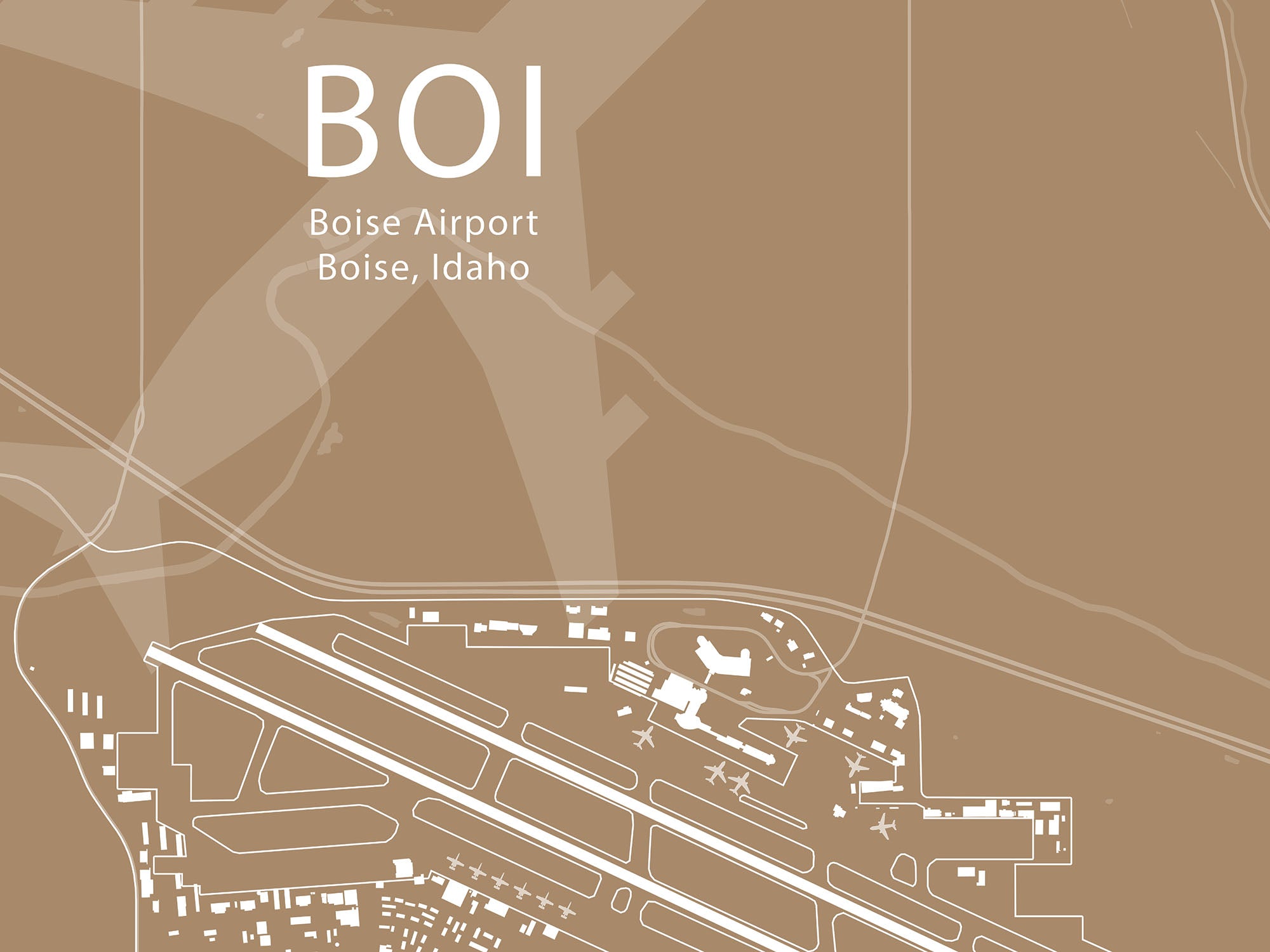 Introducing our captivating Wall Art Airport Map of Boise, Idaho (KBOI) – the perfect blend of artistic elegance and geographic precision. This meticulously crafted piece is more than just a map; it's a unique and stylish homage to the vibrant city of Boise and its bustling airport.