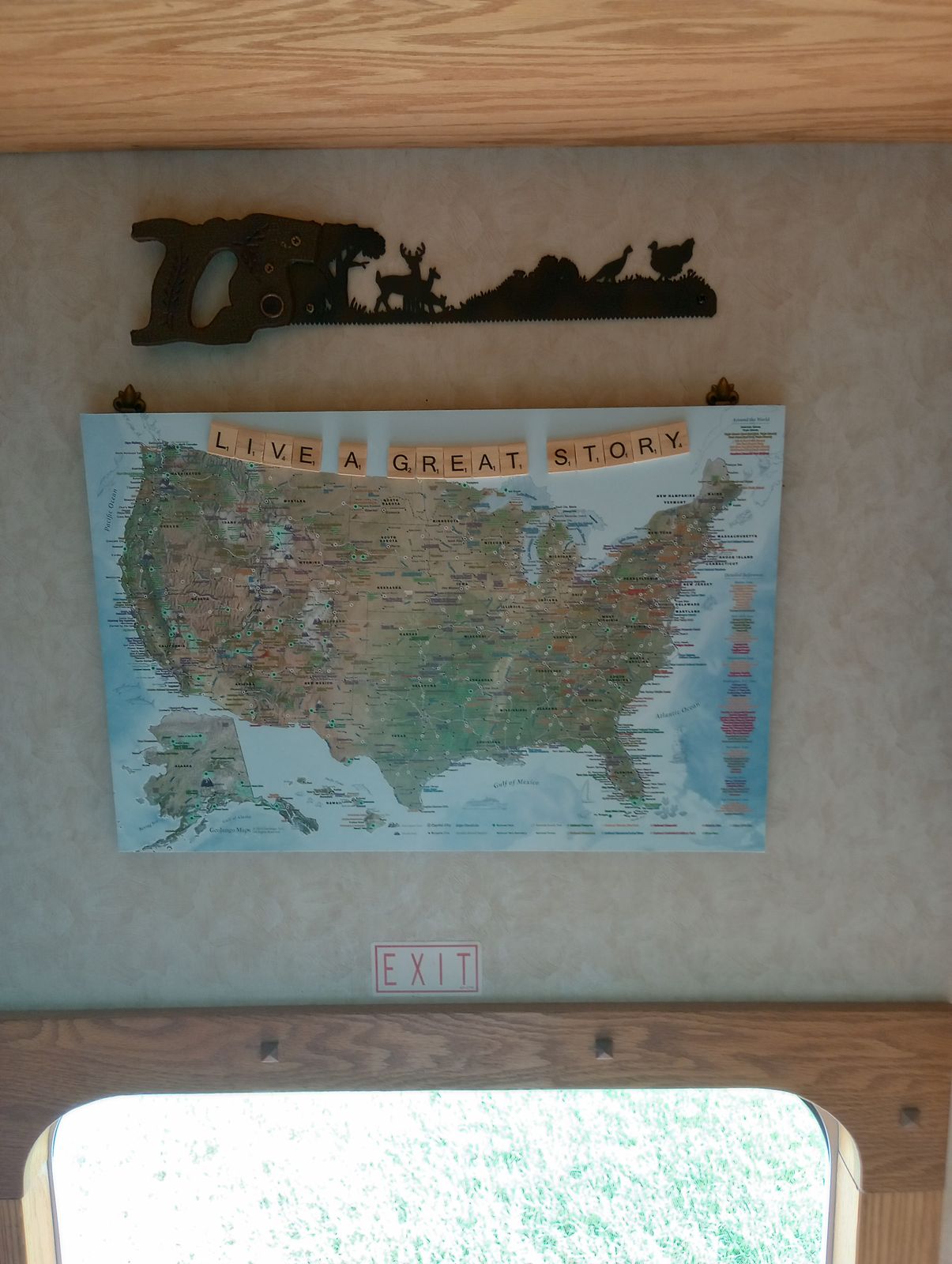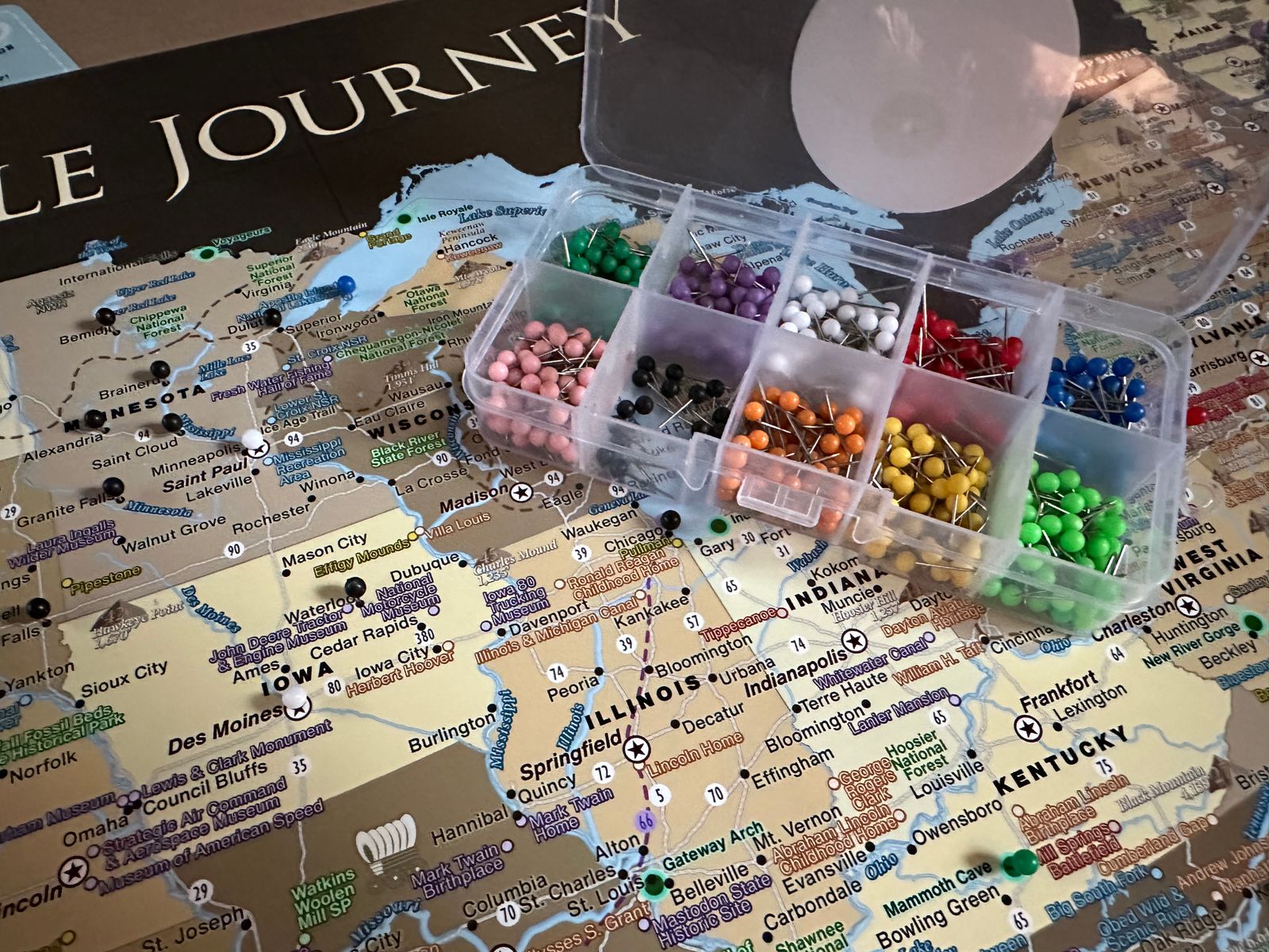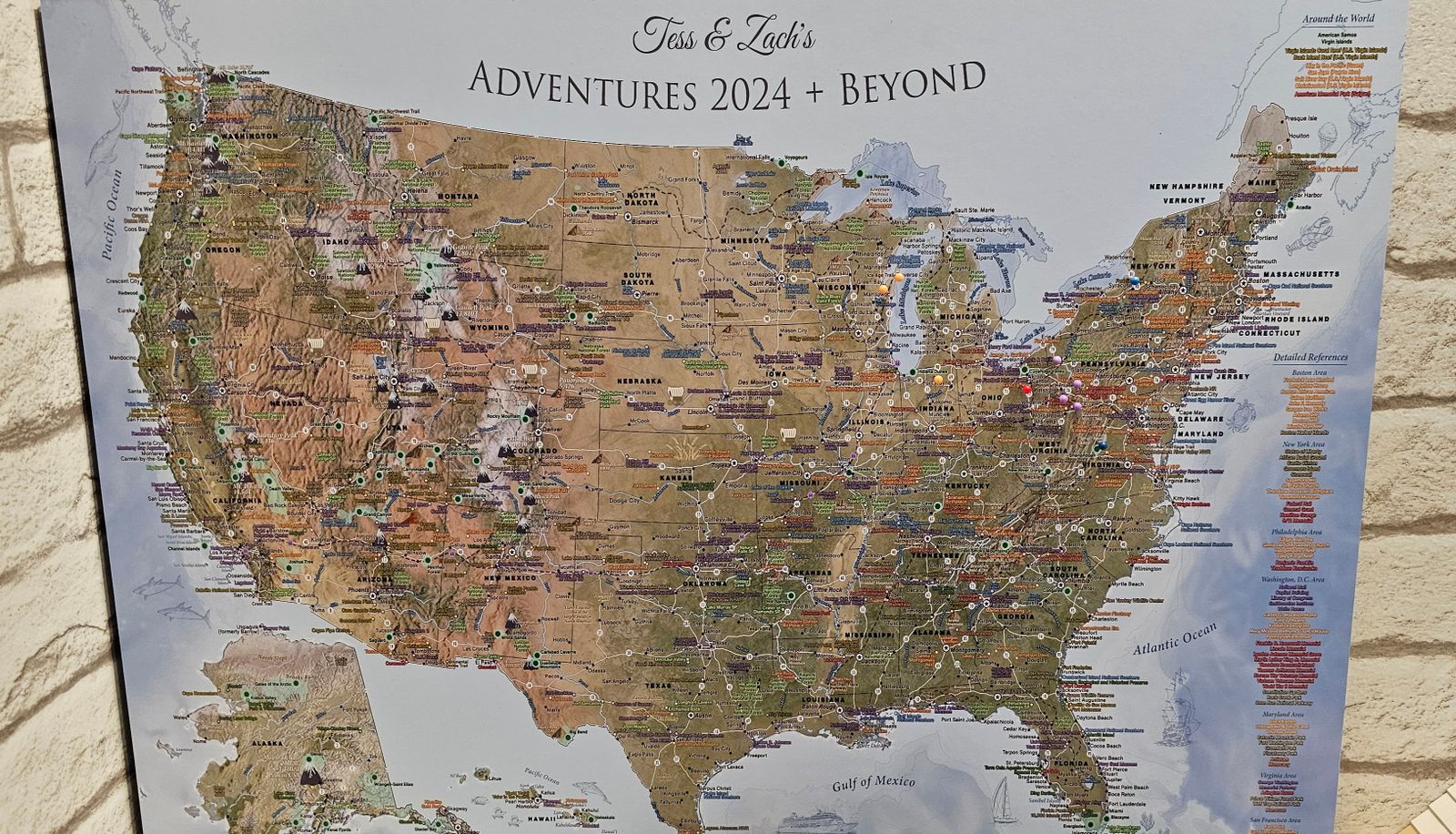 First of all, I want to say thank you for creating a beautiful piece of functional art! We LOVE that we get to track our journeys through the US in our brand-new RV! It's fun, and we've already marked off ten different campsites we've ventured to. This was the perfect wedding/honeymoon gift my future hubby and I received. We're on our way from the East Coast to tour across the country to be wed in the Grand Tetons and then, over a month-plus, staying from campsite to campsite, all the way back to the northern East Coast, tracking our adventure place by place, pin-head by pin-head.