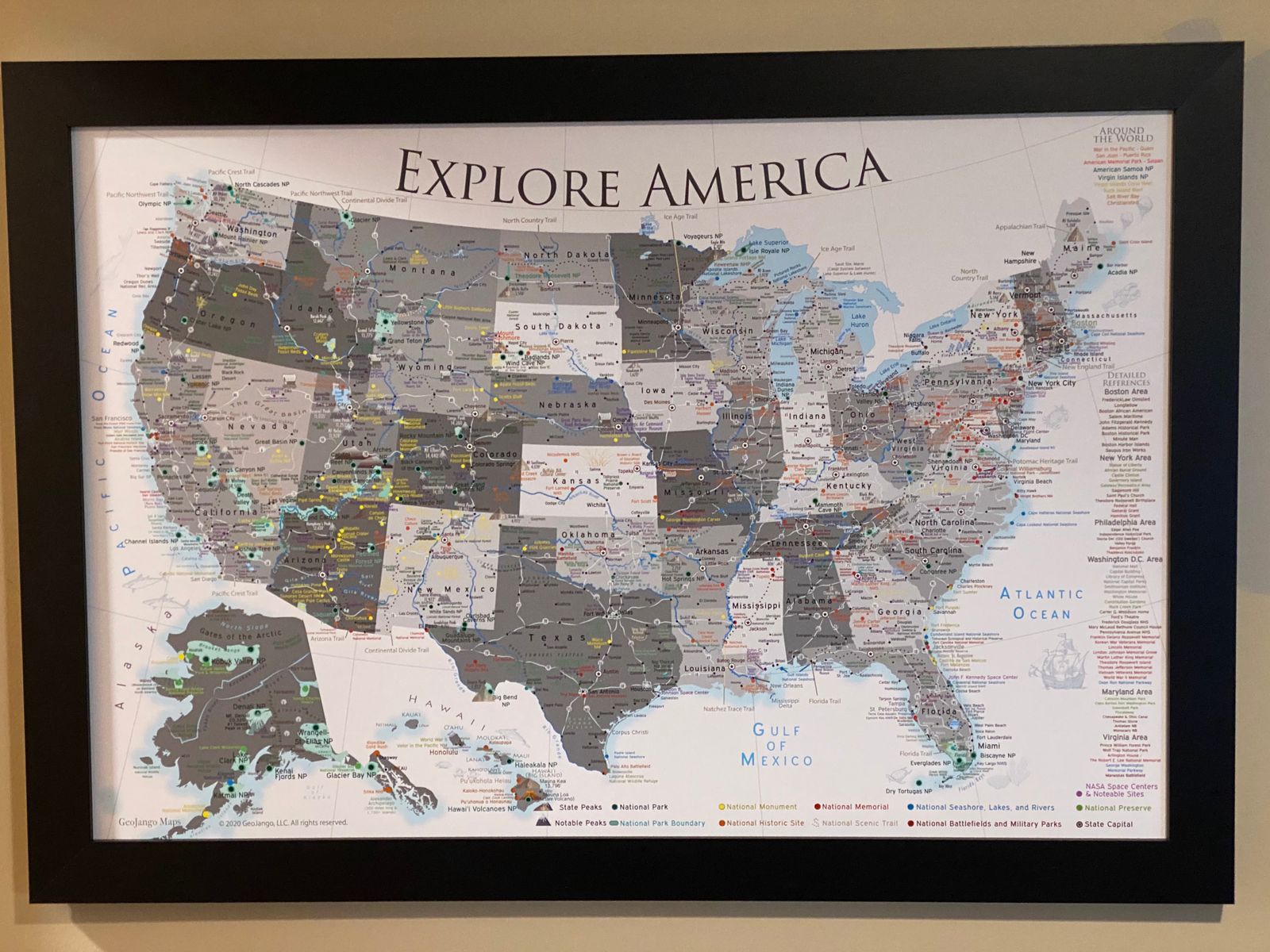 What sets our maps apart is our expertise in Geography, working directly with the National Park Service mapping division, and being masters with GIS data. Our maps are educational and include important references including the state capitals, iconic landmarks, and the tallest peak in every state. It serves as a visual checklist of your explorations, a storyteller of your travels, and a planner to uncover even more of America's hidden gems.