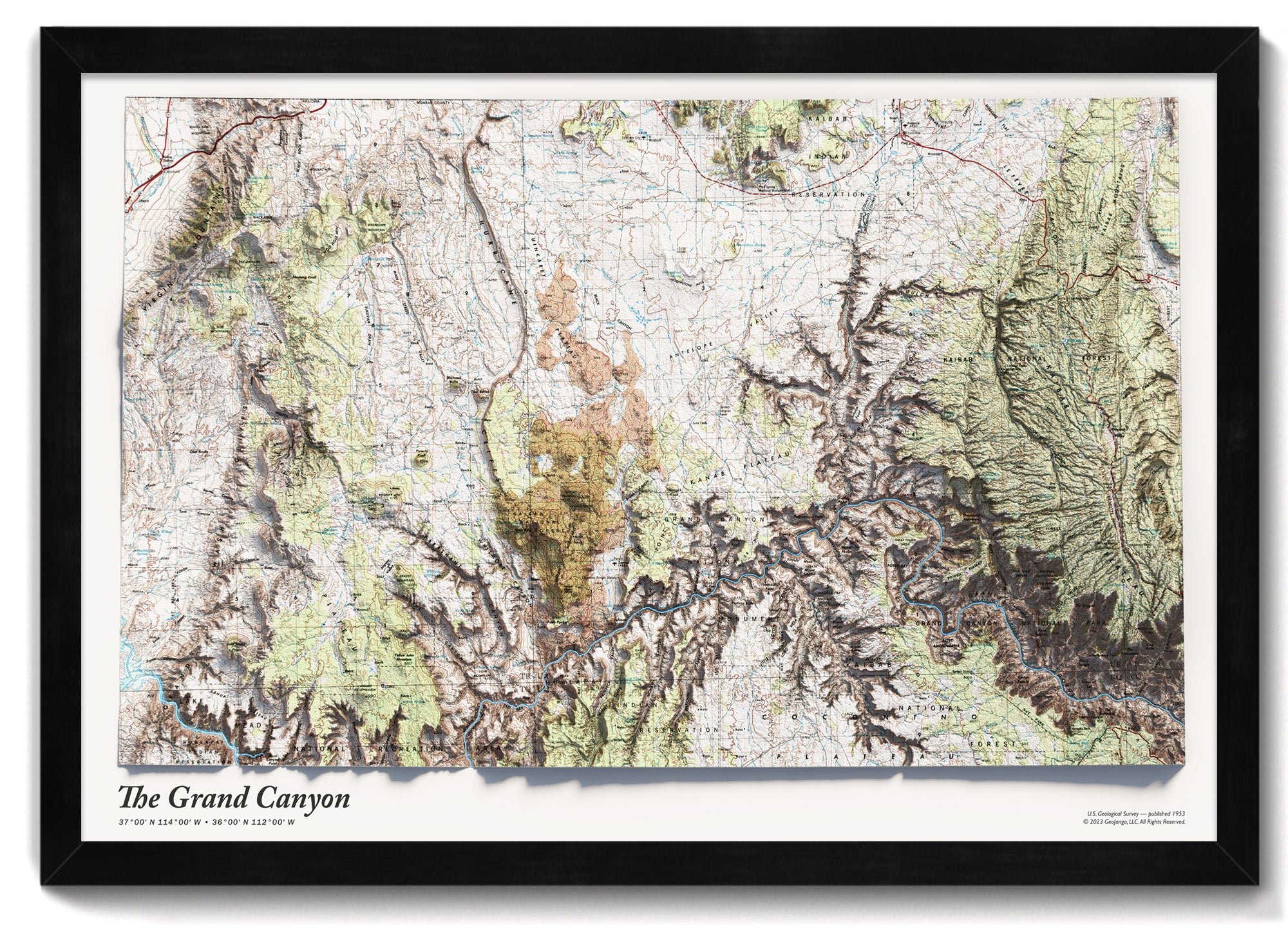 The map is expertly shaded to simulate the interplay of light and shadow across the rugged landscape, highlighting the intricate geological formations and majestic plateaus that make up this breathtaking natural wonder. Whether you're a seasoned hiker, a curious traveler, or simply an admirer of the great outdoors, this map is the perfect addition to any home or office.