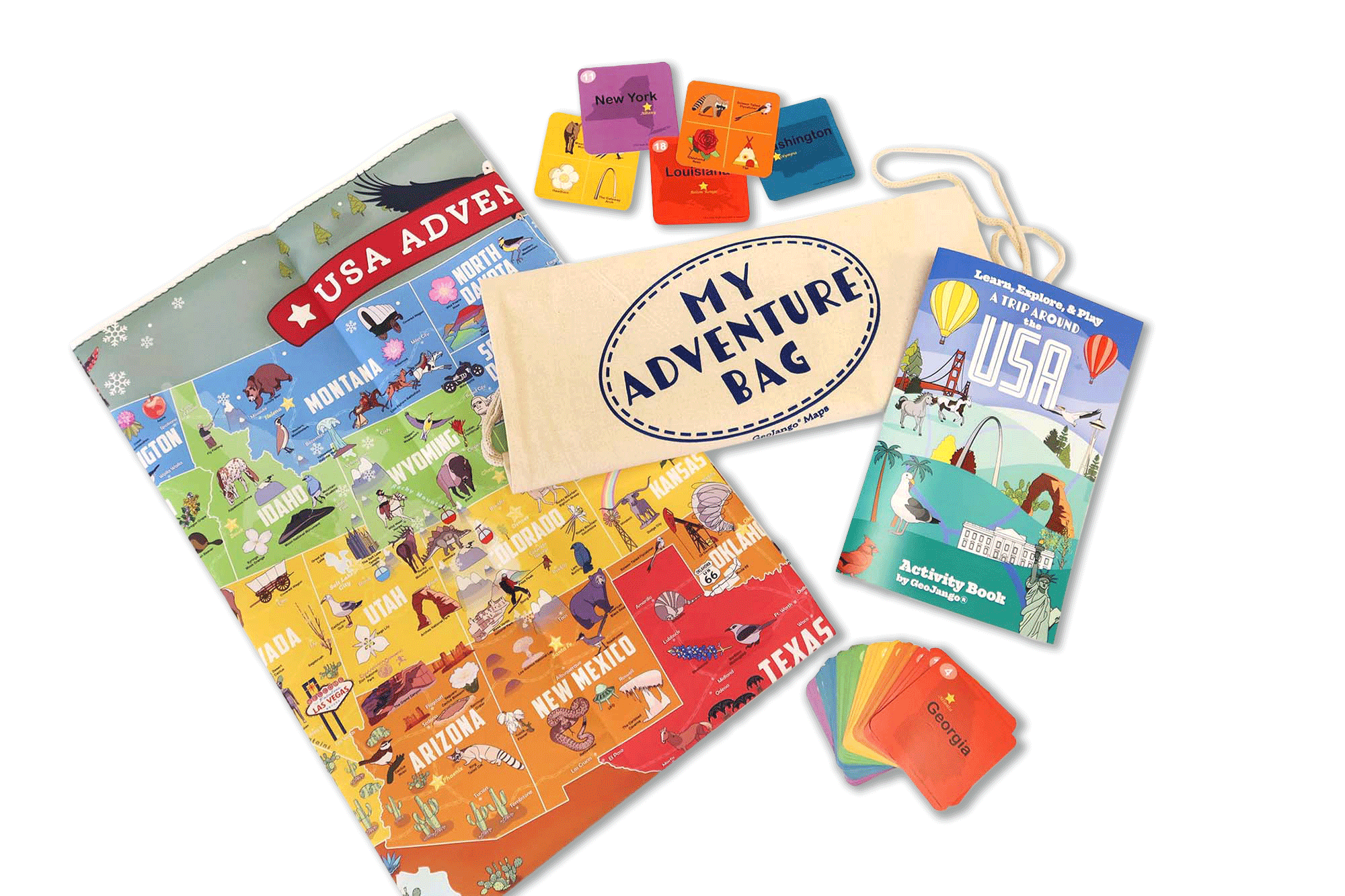 For exclusive wholesale buyers: The USA Kids Adventure Map & Game. Includes a giant fabric map (that is tear and water resistant); Deck of 54 Game Cards; USA Adventure Activity Book; and Adventure Bag. Made in the USA by USA Small Business in Pleasanton, CA. Quick production and shipping.