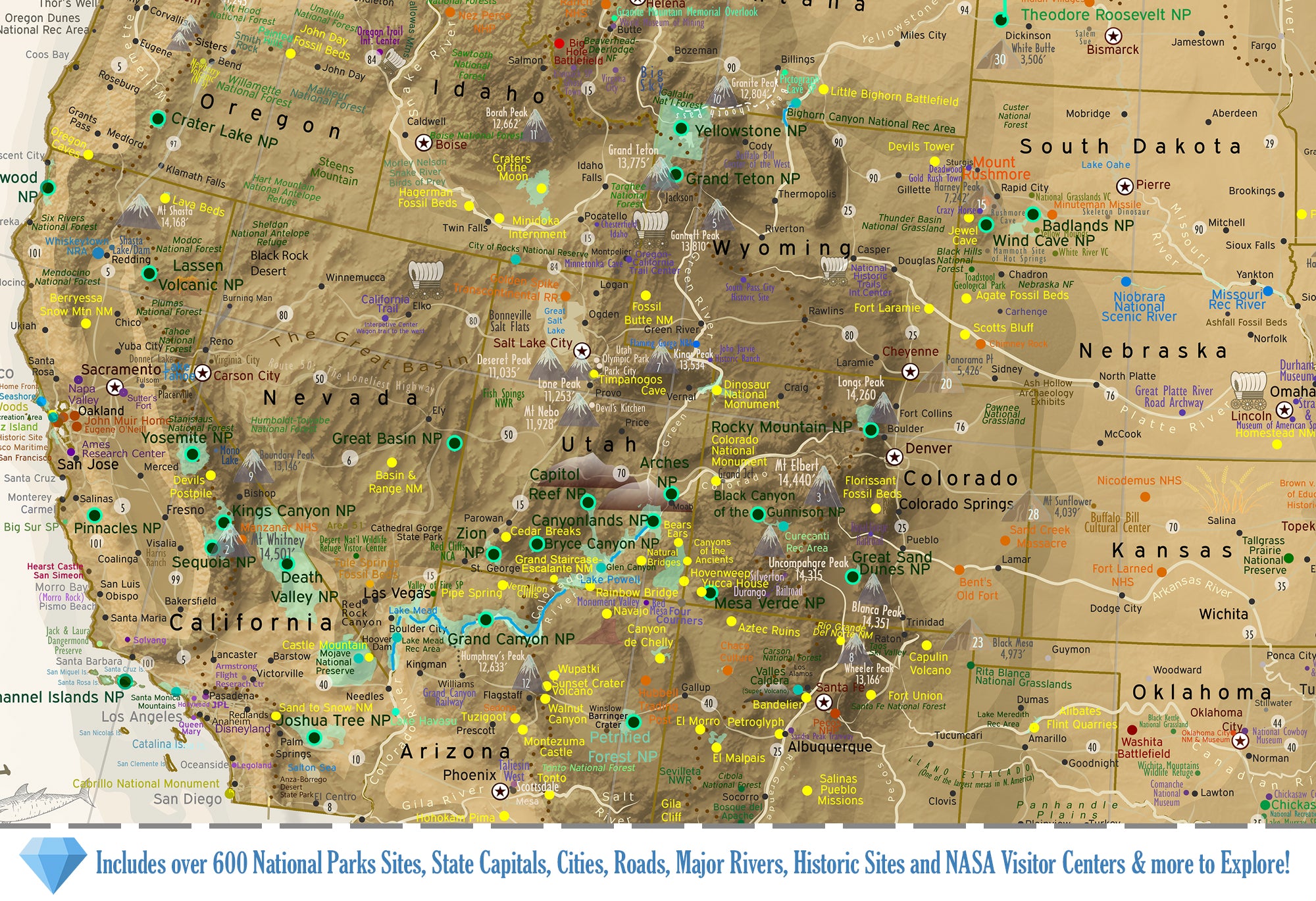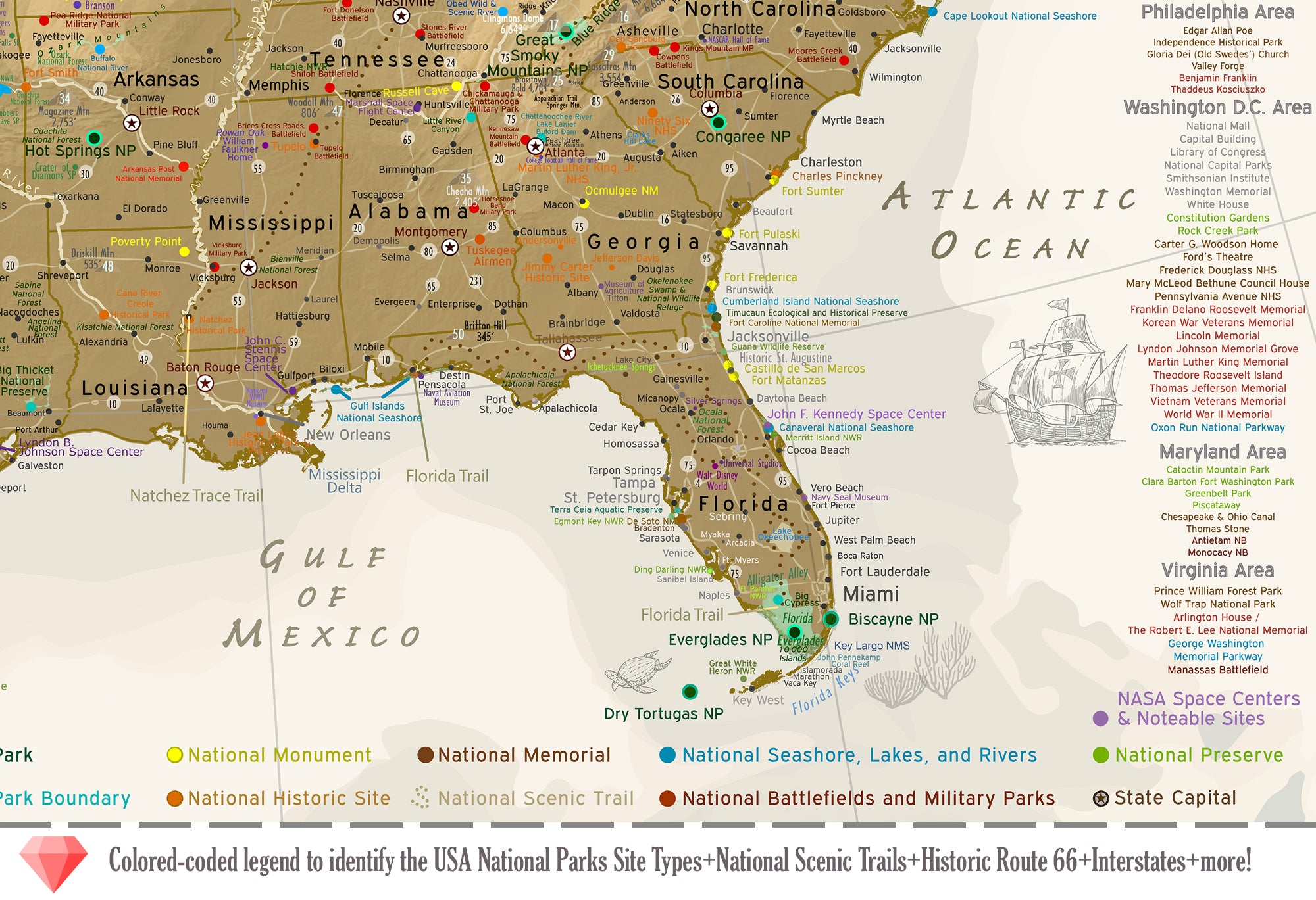 For exclusive wholesale buyers: USA National Park Map: A highly-detailed National Park with NPS National Monuments and Historical Sites map of the United States. Ideal for Museum and Educational Shops. A stunning map that was created by a professional Geographer showing the amazing sights across the USA.