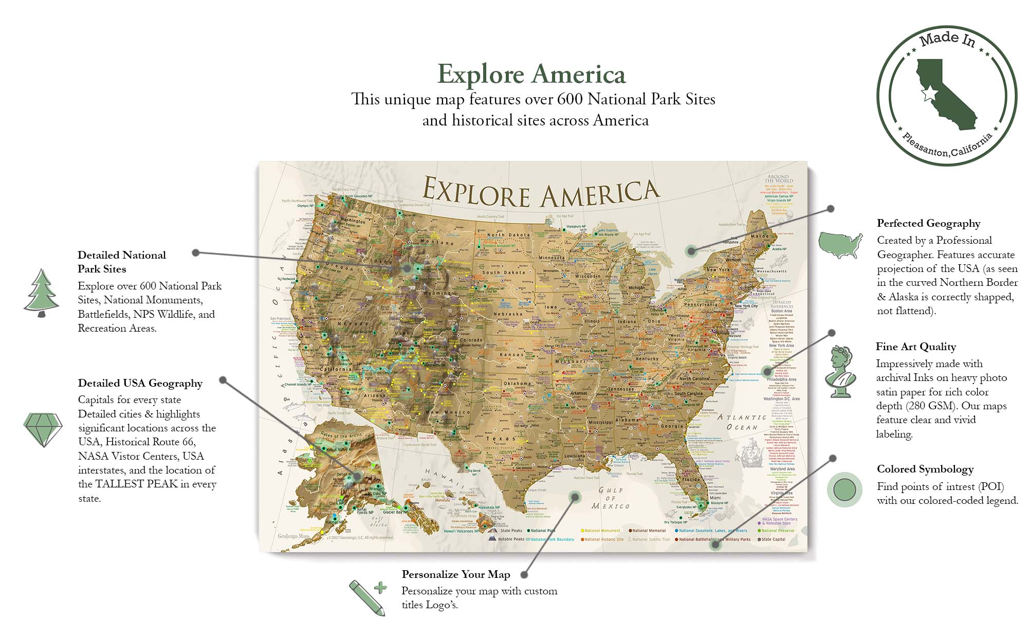 Customize with quotes, legends, or dedications using "Personalize Map" options to craft your masterpiece map. Or reach out to us if you don't see the option you want.
