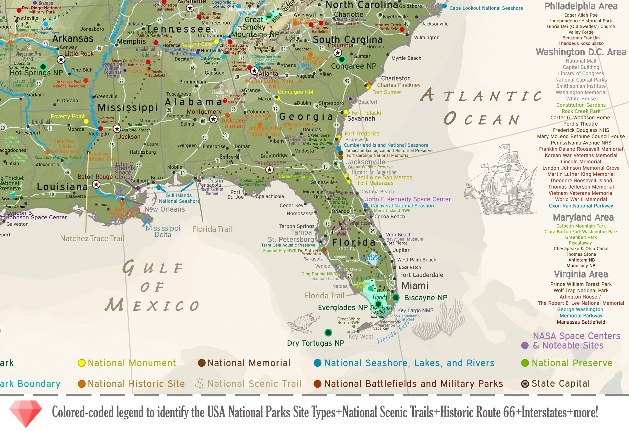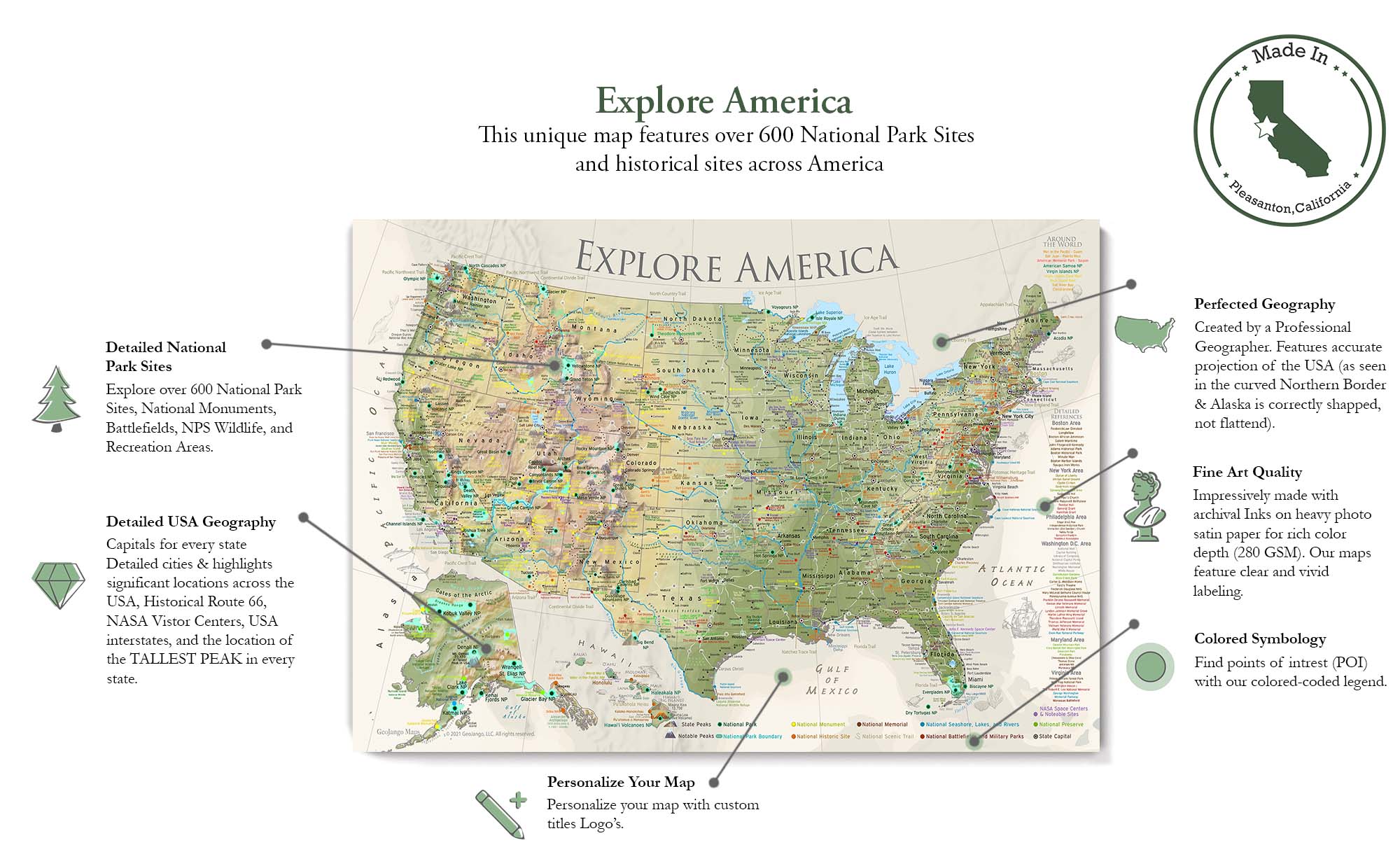 For exclusive wholesale buyers: USA National Park Map: A highly-detailed National Park with NPS National Monuments and Historical Sites map of the United States. Ideal for Museum and Educational Shops. A stunning map that was created by a professional Geographer showing the amazing sights across the USA.