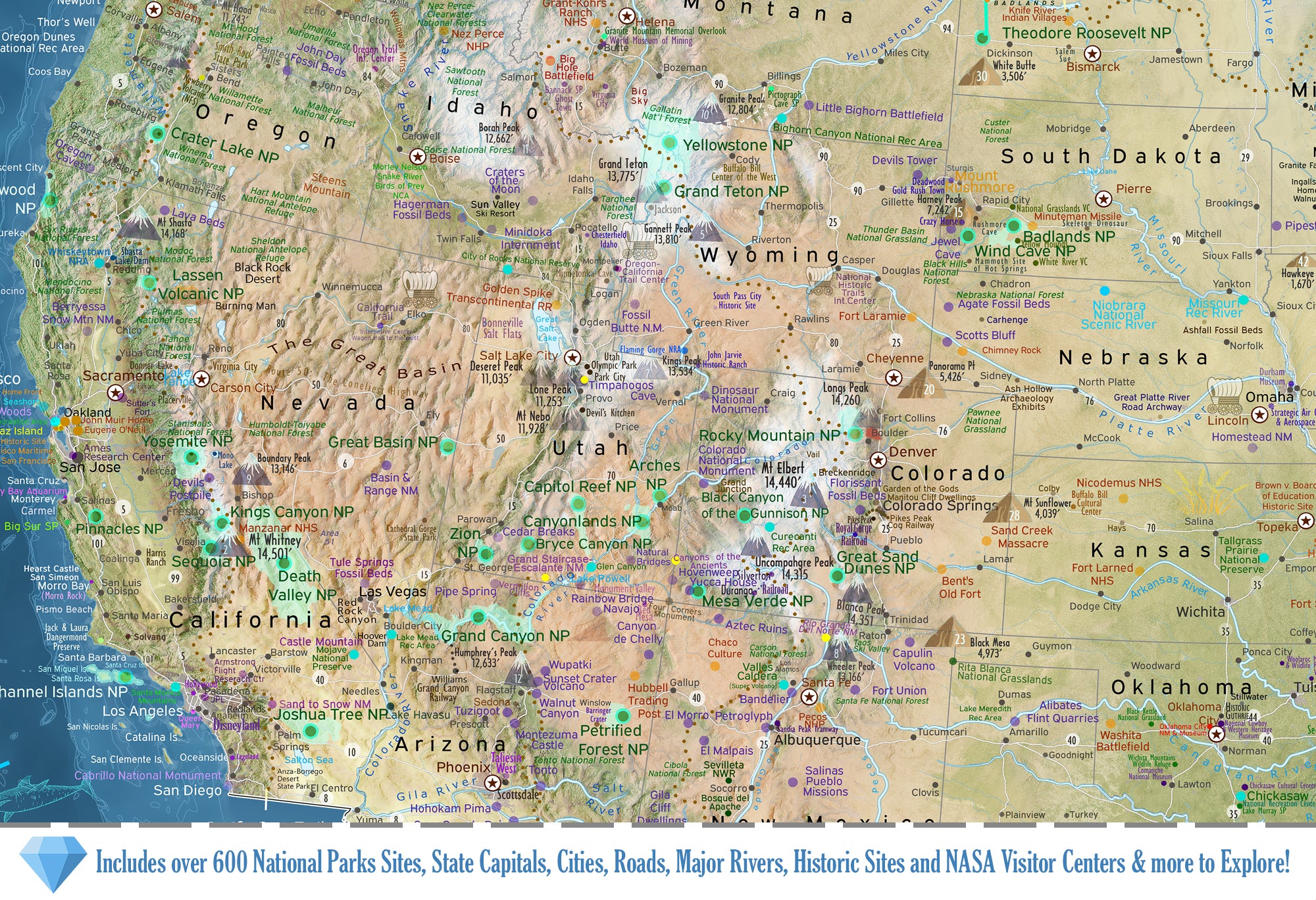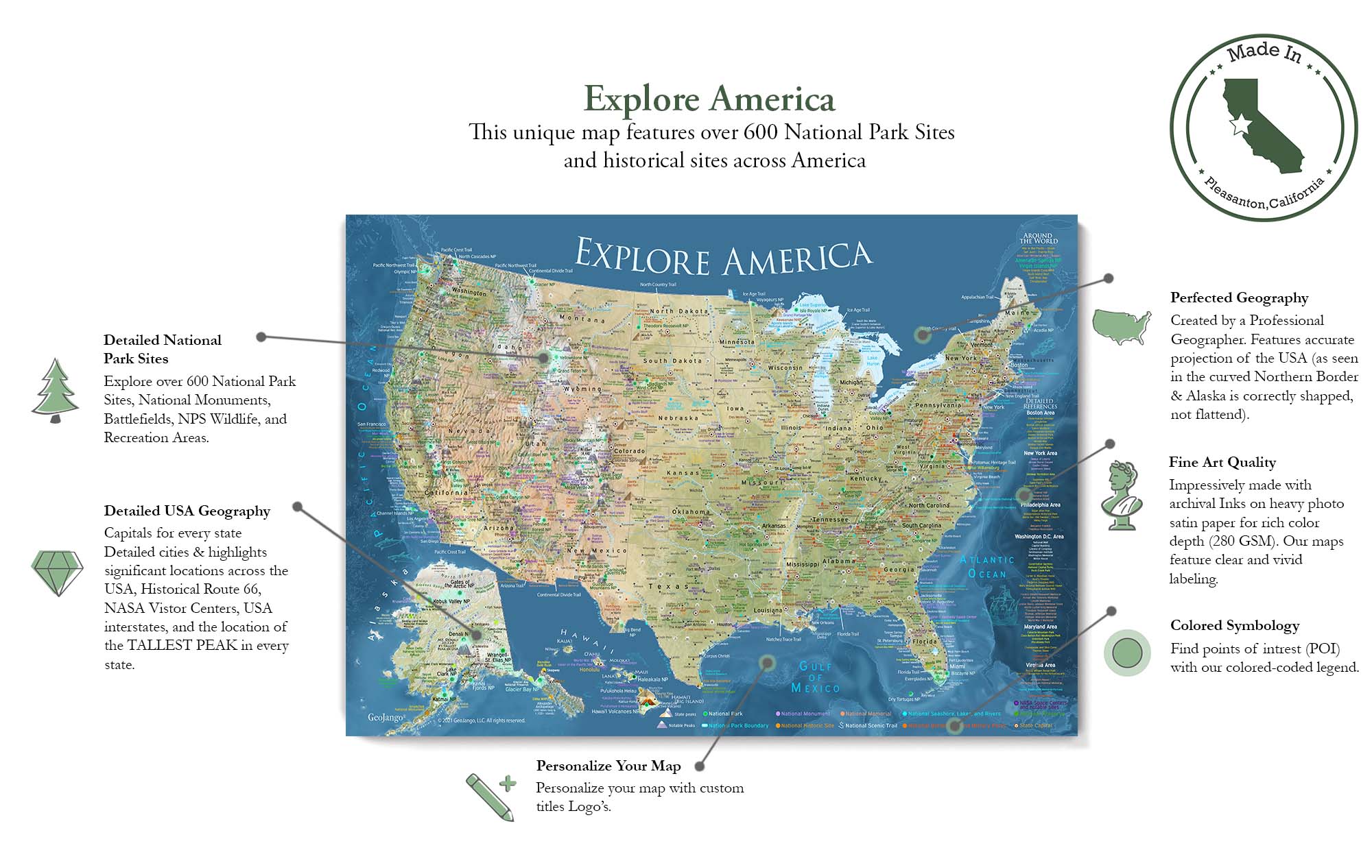 For exclusive wholesale buyers: USA National Park Map: A highly-detailed National Park with NPS National Monuments and Historical Sites map of the United States. Ideal for Museum and Educational Shops. A stunning map that was created by a professional Geographer showing the amazing sights across the USA.