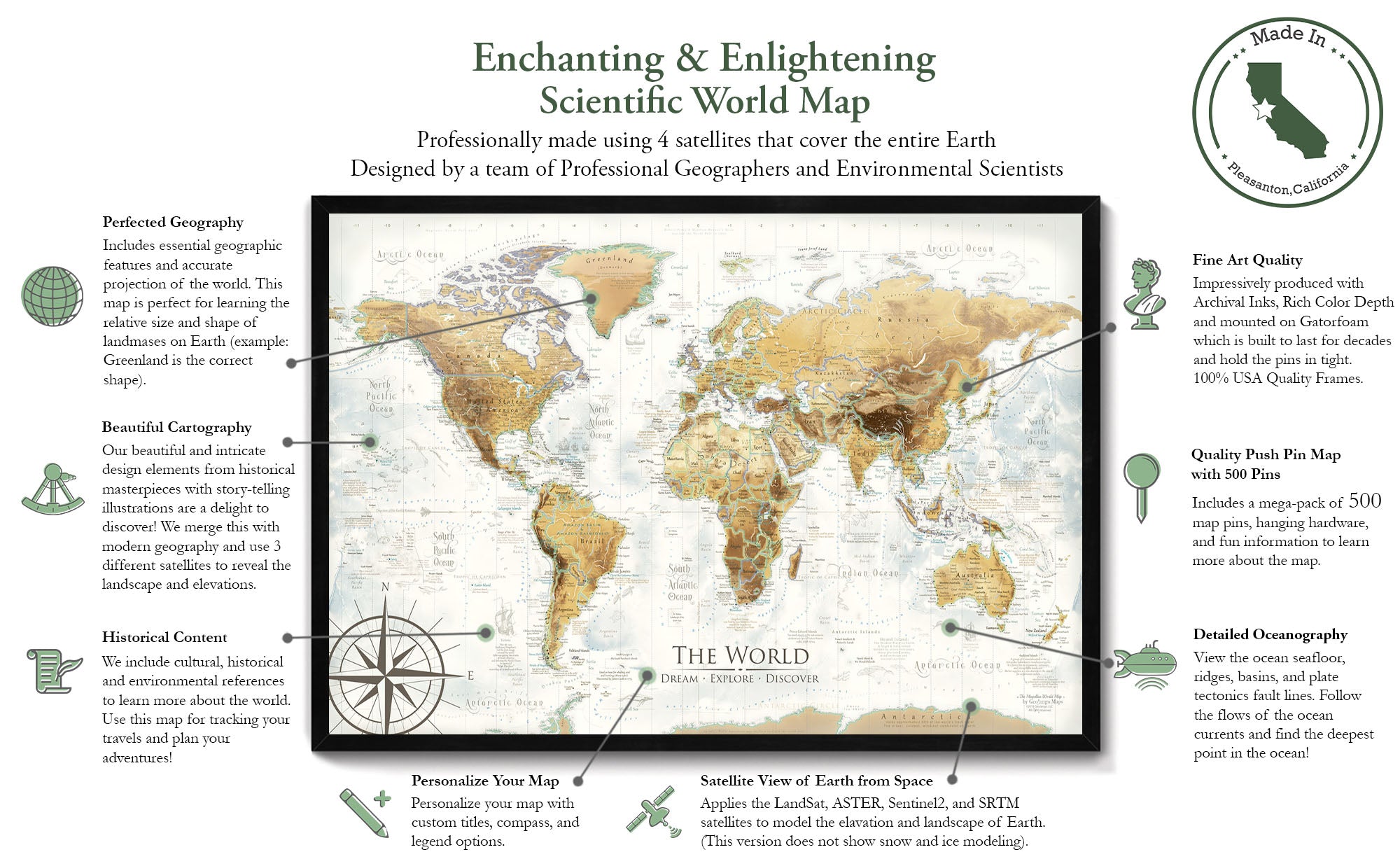 For exclusive wholesale buyers: Magellan World Map: A highly-detailed topographical map of the world. Ideal for Museum and Educational Shops. A stunning map that was created from satellite data showing the beauty of Earth.