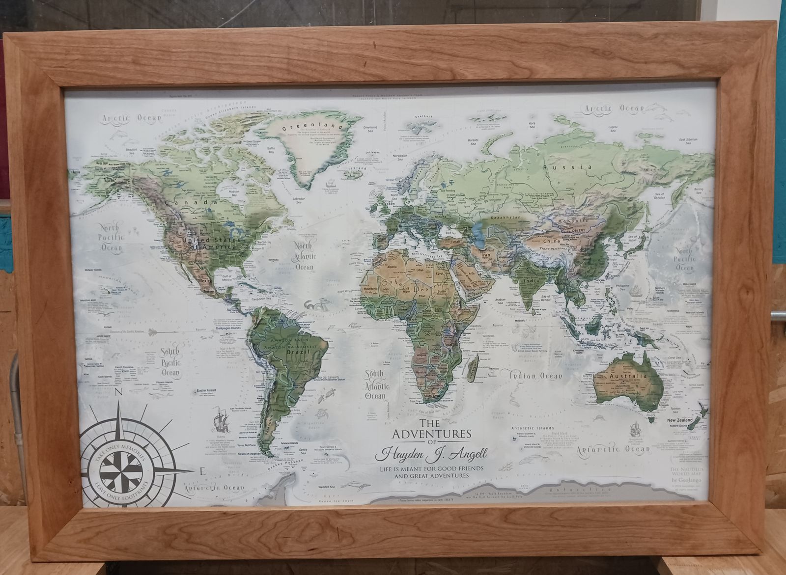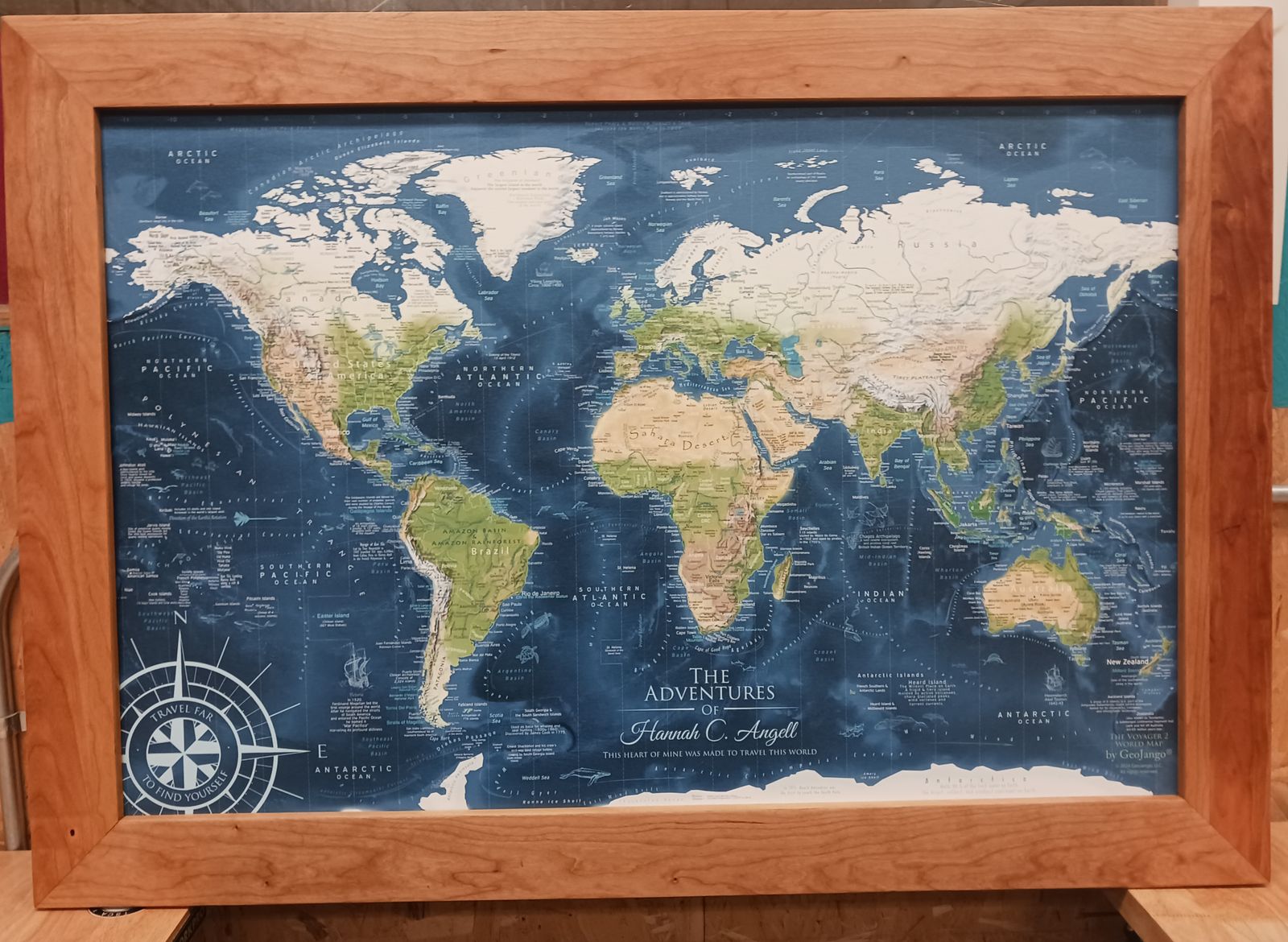 I purchased three canvas maps as gifts for my three almost-adult children so they could pin places they have traveled. Travel is a big interest for our family, and we so value the experience and educational aspects. I had personalized messages added to each and had them sent unframed so I could do that part myself. GeoJango exceeded my expectations through every part of the process, and the final product was awesome! I attached a couple of pictures of the final product, I added cherry frames.