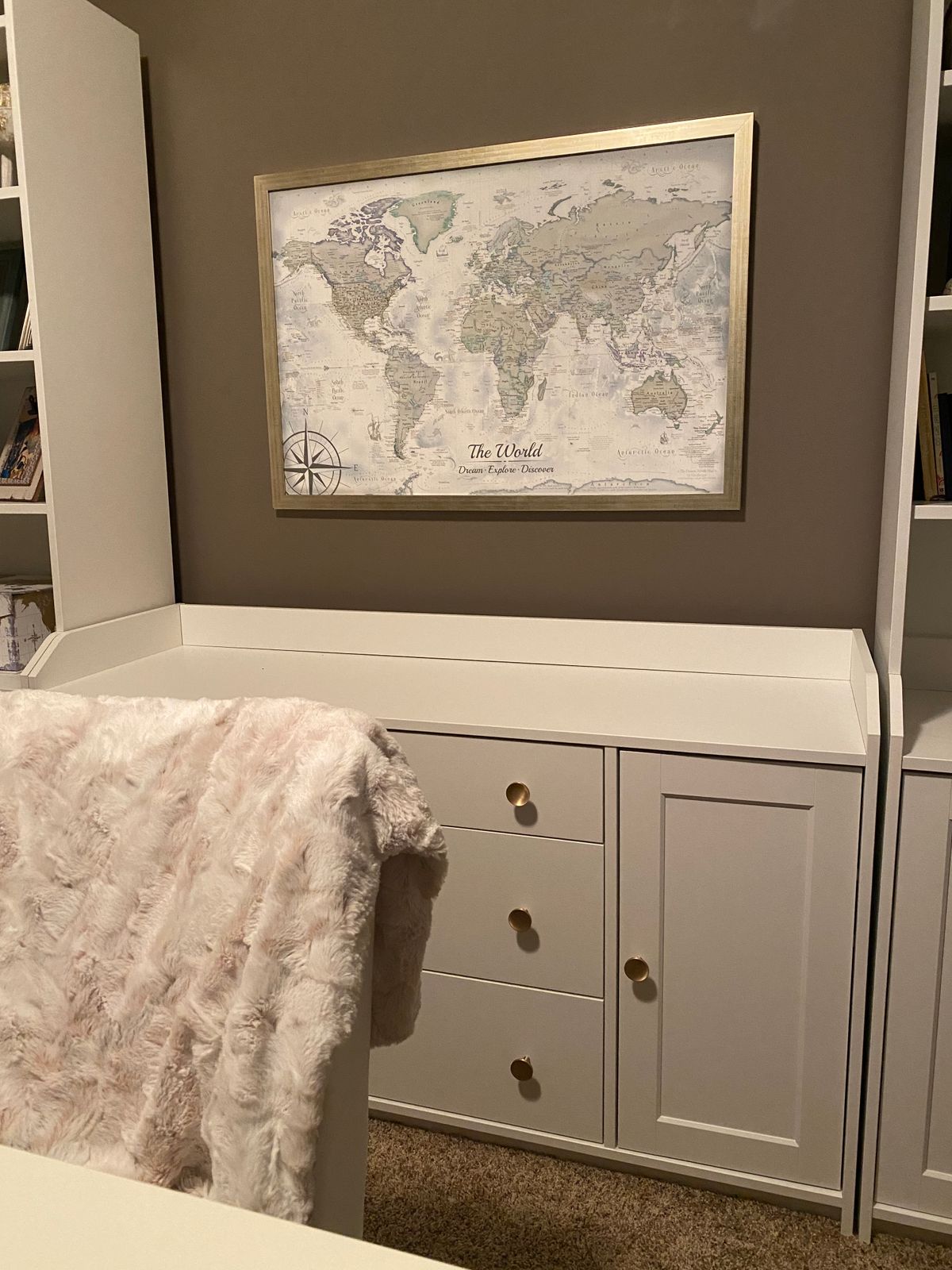 Love this map! I ordered the canvas gold framed world map. The gold frame wasn’t a cheap looking gold. It’s very modern and classy. It was so easy to hang by myself. It has a special hanging system that was awesome and I wish I could use it for everything I have to hang. Highly recommend!!!